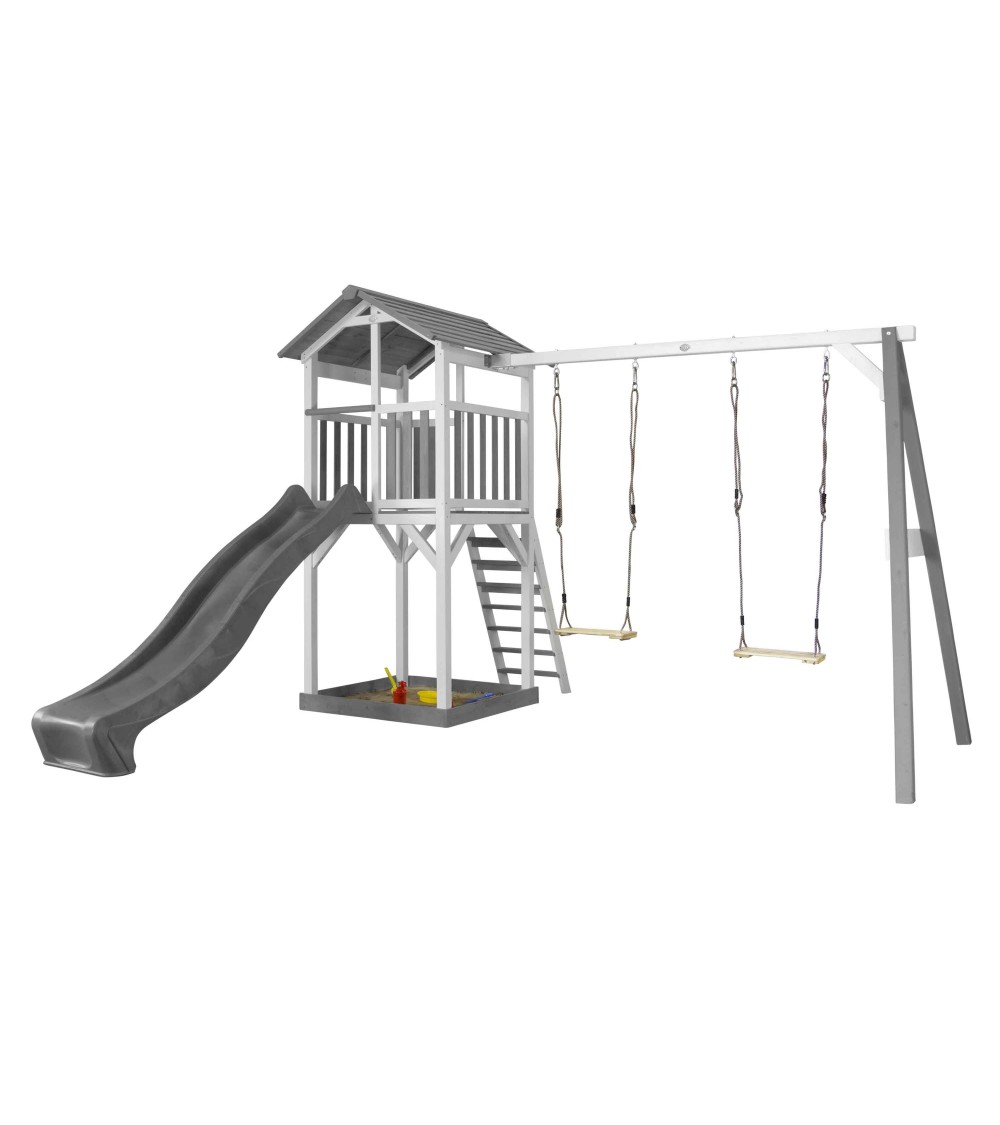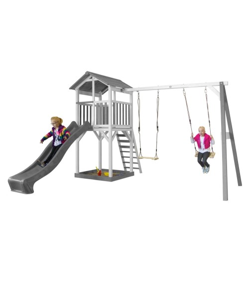 Voici une structure de jeu comme à la plage, ouverte sur le monde à 360 degrés. En bois de Hemlock , un bois très résistant, naturellement imputrescible, insensible aux champignons et insectes. Bois non-traité chimiquement, donc plus écologique et plus sur pour les enfants.100% FSC , donc en provenance de forêts gérées selon des principes de développement durable . Facile à construire en raison de l'utilisation de panneaux pré-percés prêts à l'emploi et déjà peint et traités avec un vernis à base aqueuse non chimique. Garantie 10 ans !! Les tours de jeu AXI portent le marquage CE et ont été testées et produites conformément aux normes de sécurité EN 71 pour garantir la sécurité du jeu. Elle dispose d'un toboggan de 220 cm avec raccordement d'eau, et d'un bac à sable installé sous la plateforme, pour environ 125 kg de sable, dim 105 x 101 x 10 cm. Hauteur de la plate-forme : 117,5 cm Le portique est entièrement en bois et comporte des entretoises pour une stabilité accrue. Inclut : 2 sièges de balançoire en bois réglable en hauteur. 2 ancrages au sol pour plus de stabilité et de sécurité. Hauteur portique: 207 cm Poids maximum sur la plateforme: 150 kg et 150 kg pour la balançoire Cadre composé de poutres de 7 cm d'épaisseur Dimensions ''hors tout'' : 357 x 349 x h 242 cm . Convient aux enfants de 3 ans et plus.