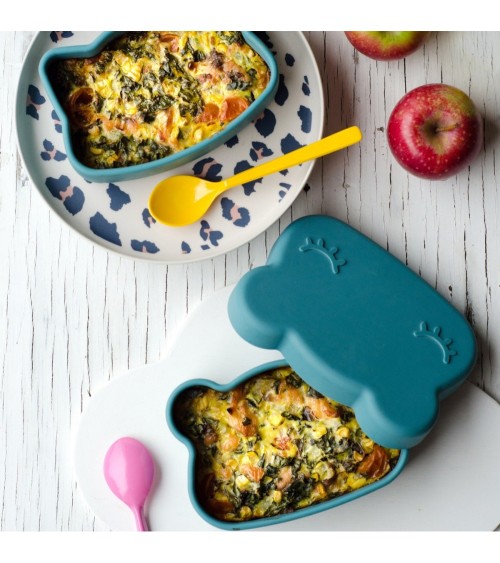 Boîte à goûter en silicone ours We Might be TinyCette jolie boîte à goûter design en silicone accompagnera les enfants durant leurs 1ères années d'école.Elle pourra vous servir d'assiette et de bol à la maison du petit-déjeuner au dîner. Elle peut être mise au micro-ondes lorsque le contenu doit être réchauffé.Pour le goûter elle peut contenir une gourde de compote et des biscuits.On peut aussi s'en servir comme moule et y faire cuire de jolis gâteaux qui auront alors la forme d'ours, de chat ou de lapin suivant le modèle !Compatible four, micro-ondes et congélateurRésiste à des chaleurs de -40 °C à 230°C maximumRésistante aux chutes et antidérapanteDimensions15 x 10 x 4,5 cmComposition / MatièreSilicone alimentaire EntretienNettoyage au lave-vaisselle.NormesConforme aux normes EN71 et CE.Âge conseillé12mAvertissementAttention, certains colorants naturels contenus dans les aliments peuvent laisser des tâches.Ne pas couper les aliments dans la boîte avec un couteau pointuPour la sécurité de l'enfant et par mesure d'hygièneAVERTISSEMENT !Ce produit doit toujours être utilisé sous la surveillance d'un adulte !Avant chaque utilisation, examiner le produit. Le jeter dès les premiers signes de détérioration ou de fragilité.Toujours vérifier la température des aliments avant de donner à manger ou à boire à l'enfant.