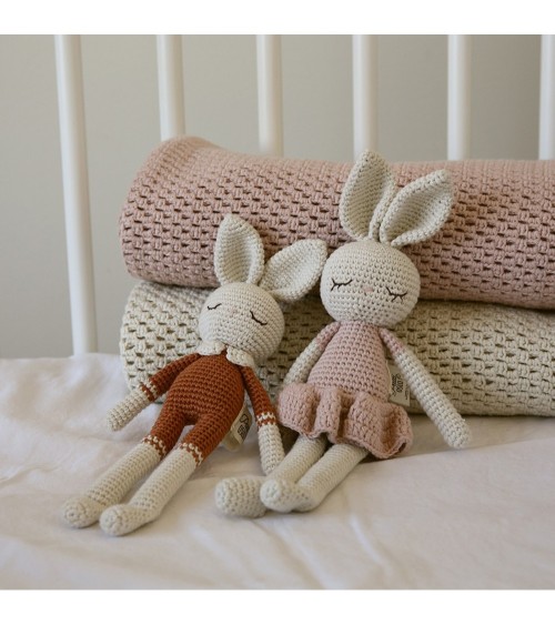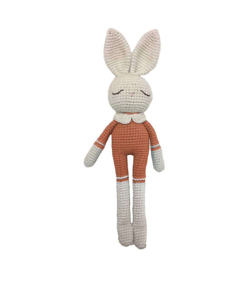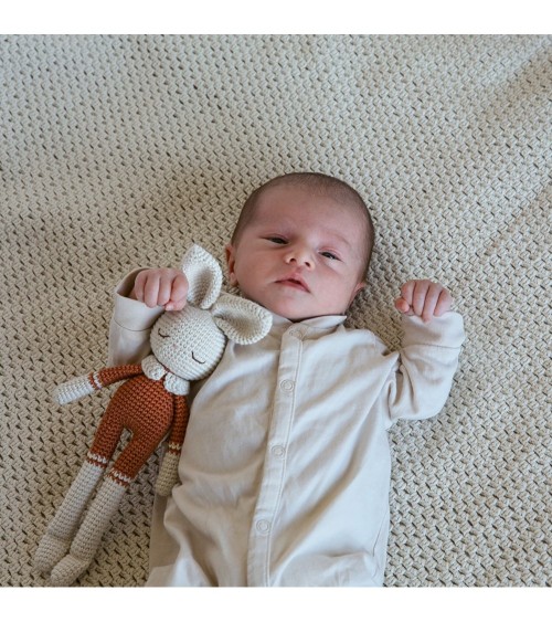 Doudou en crochet lapin Patti OsloPATTI OSLO est une marque norvégienne qui propose des jouets entièrement crochetés et brodés à la main. Ces jouets pour bébés sont fabriqués en coton bio certifié GOTS. Ils sont teints naturellement à base de plantes. Ils sont antibactériens et hypoallergéniques.Garnissage avec une fibre de polyester écologique certifiée selon la norme Oeko-Tex® STANDARD 100 Classe I.Ce doudou crochet lapin est un cadeau de naissance idéal. Livré dans un joli petit sac en coton.Commerce équitableCe sont des femmes artisans indépendantes qui fabriquent ces jouets, en utilisant des techniques traditionnelles.En choisissant les produits Patti Oslo vous contribuez à donner un revenu équitable à ces femmes talentueuses.Fabriqués éthiquement en Turquie.Dimensions29 cmComposition / MatièreFabriqué en coton bio certifié GOTS, teint naturellement à base de plantes, antibactérien et hypoallergénique.Rempli d'une fibre de polyester écologique certifiée selon la norme Oeko-Tex® STANDARD 100 Classe I.EntretienUtilisez toujours un détergent doux et de l'eau froide. Commencez par nettoyer les taches.Si le nettoyage des taches ne suffit pas, choisissez un programme de lavage à la main à 30 ° avec un savon doux pour bébé, essorage à faible vitesse, faire sécher à plat.NormesConforme aux normes CE et EN-71Âge conseillé0