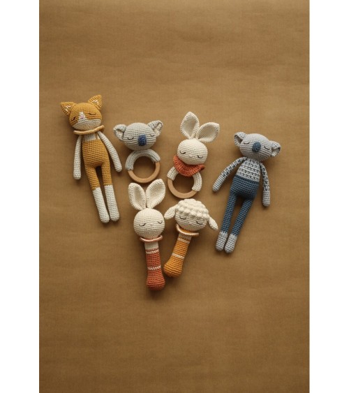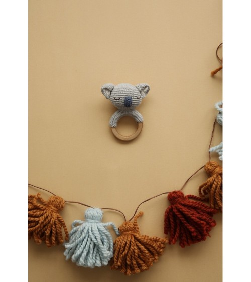 Anneau de dentition en crochet koala Patti OsloCet anneau de dentition en crochet avec sa douce tête de koala soulagera les bébés lors des poussées dentaires. La tête contient un grelot ce qui en fait aussi un petit hochet pour s'amuser, facile à tenir pour les petites mains.Livré dans un joli petit sac en coton.PATTI OSLO est une marque norvégienne qui propose des jouets entièrement crochetés et brodés à la main. Ces jouets pour bébés sont fabriqués en coton bio certifié GOTS. Ce sont des femmes artisanes indépendantes qui fabriquent ces jouets, en utilisant des techniques traditionnelles.En choisissant les produits Patti Oslo vous contribuez à donner un revenu équitable à ces femmes talentueuses.Fabriqués éthiquement en Turquie.Dimensions13 cmComposition / MatièreFabriqué en coton bio certifié GOTS, teint naturellement à base de plantes, antibactérien et hypoallergénique.Rempli d'une fibre de polyester écologique certifiée selon la norme Oeko-Tex® STANDARD 100 Classe I.Anneau en bois d'érable.EntretienNettoyez à la main avec un détergent doux et de l'eau froide.NormesConforme aux normes CE et EN-71Âge conseillé0+AvertissementRetirez l'emballage et toutes les étiquettes avant utilisationVérifiez et nettoyez le produit avant de le donner à votre enfant.