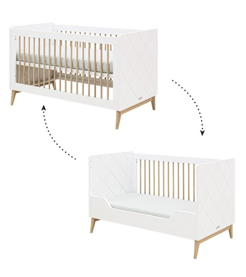 Signé de la marque Bopita, le lit évolutif 70x140 issu de la collection Paris est à mettre dans toutes les chambres d'enfants. Modulable, il se transformera facilement en lit banquette grâce à ses barreaux amovibles.Caractéristiques produitMarque : BopitaMatériaux : MDF et bois de chêneMeuble laqué blanc et chêneLit : sommier réglable en hauteurLit : muni de barreaux amovibles permettant de le transformer facilement en lit banquetteLit conforme aux normes européennes de sécuritéPoids net lit évolutif : 52 kgLit évolutif Bopita: 145 x 77 x 89 cmMeuble livré sans matelas, avec sommier à monter, avec notice incluse.Produit Bopita garanti 60 Mois.Matelas vendu séparément