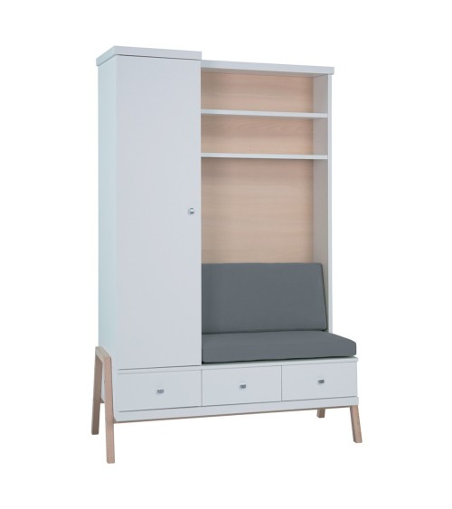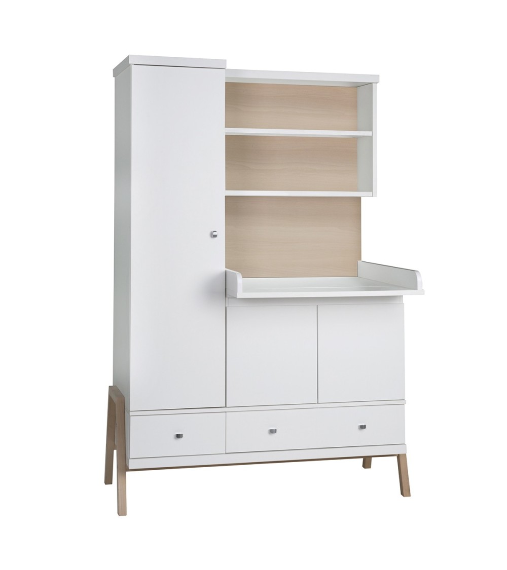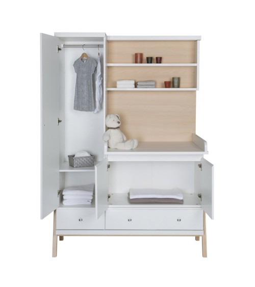 La marque Schardt propose des meubles de fabrication Allemande pour emménager la chambre de votre enfant.Marque : Schardt -Gamme : Charly -FABRICATION ALLEMANDE -Couleur : Blanc et bois -Matériaux : Panneaux MDF - Peinture à base d'eau -Produit : Armoire à langer -1 portes - 2 tiroirs - 1 penderie et 1 étagère derrière la porte de gauche - 2 étagères au dessus du plan à langer -Portes et tiroirs avec fermeture automatique -L'armoire peut se transformer de 2 manières : -Soit en retirant uniquement le plan à langer et en gardant les 2 caissons de rangement -Soit en retirant le plan à langer et le caisson 2 portes pour se transformer en banquette -Coussin d'assise et dossier vendus séparément -Produit : Plan à langer -Amovible - Rebords de protection -Poids et dimensions armoire à langer : 130 -kg - 131 x 53 x 191 cm -Dimensions plan à langer : 80 x 70 cm -Hauteur du plan à langer: 93 cm -Profondeur avec le plan à langer : 72 cm -Garantie : 24 mois -Conditionnement : Armoire à langer Schardt, livrés avec plan à langer, à monter, avec notice incluse.