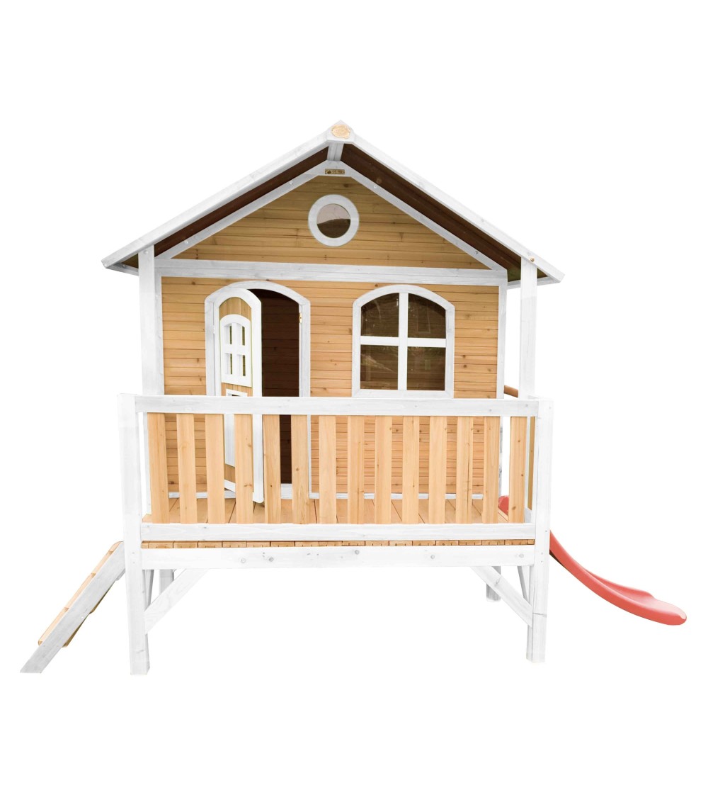 Maisonnette sur pilotis en bois brun/blanc avec toboggan rouge