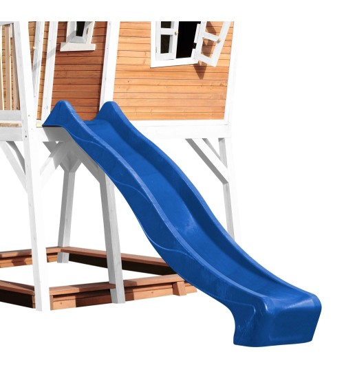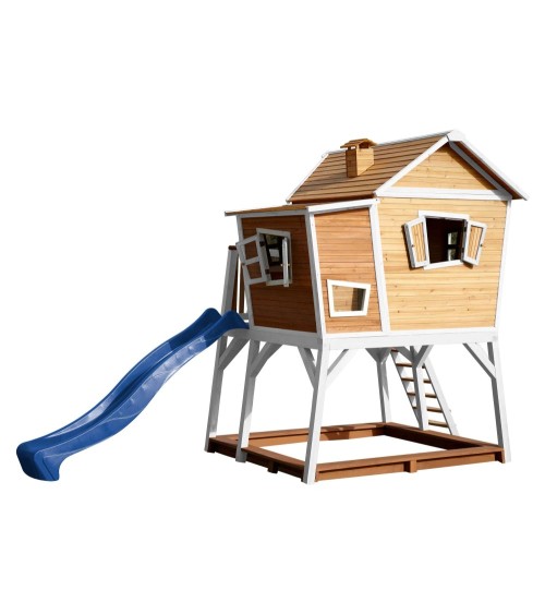 Vos enfants vont jouer pendant des heures en toute sécurité avec la maisonnette sur pilotis Max d'AXI. Son design > est unique ! Cette cabane est en bois de Hemlock, avec un toit en cyprès. Ce sont des bois très résistants, naturellement imputrescibles, insensibles aux champignons et insectes, et garantis 10 ans. Bois non-traités chimiquement, donc plus écologiques et plus surs pour les enfants. Bois 100% FSC, donc en provenance de forêts gérées selon des principes de développement durable. Toute la cabane est livrée peinte et traitée avec un vernis aqueux sans produit chimique. Les fenêtres sont en plexiglass. Une fenêtre a des volets, et plusieurs s'ouvrent. Les fenêtres et la porte sont dotées d'une fermeture aimantée, et la porte a une fente pour glisser le courrier Le toboggan fait 118cm et peut être attaché des 2 cotés. Une arrivée d'eau peut y être jointe. Le bac à sable contient jusqu'à 600 kg de sable (non fourni) Une bâche est fournie pour couvrir le bac à sable une fois le jeu terminé. La maison est facile à construire grâce à l'utilisation de panneaux de 15mm pré-percés et prêts à l'emploi. Cette maison de la marque AXI est marquée CE et testée et produite selon les normes de sécurité EN 71 afin de garantir un plaisir de jeu sûr. Pour enfants à partir de 3 ans Dimensions hors tout : 193 x 432 x h 288 cm, dim intérieures cabane : 115 x 175-205 x 100-165 cm. Porte : 42-55 x 100 cm Hauteur plateforme : 118cm, avec échelle. Poids max recommandé sur la plateforme : 150kg. Garantie 10 ans. Peut être décorée avec accessoires AXI vendus séparément