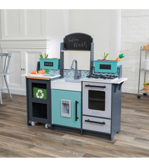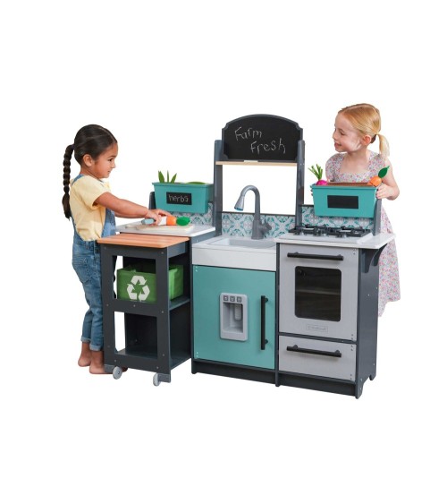 Cuisine pour enfants Garden Gourmet sons et lumières de KidKraft avec 2 balconnières à légumes et un robinet qui émet du son et de la lumière. Cette cuisine est équipée d'une plaque de cuisson avec lumières et sons, une machine à glaçons avec 3 glaçons factices, une desserte à roulettes, une planche à découper et couteau factice- une ardoise, 2 carottes et 1 oignons en bois à découper, 2 balconnières en plastique. La cuisine Garden Gourmet est réalisée en bois composite. Livrée en kit, elle se monte simplement grâce au système EZ Kraft Assembly. Piles AAA fourniesDimensions : H : 111x l : 53 (avec les jardinières) x L : 103 cm. Poids : 22 kg. Pour les enfants à partir de 3 ans