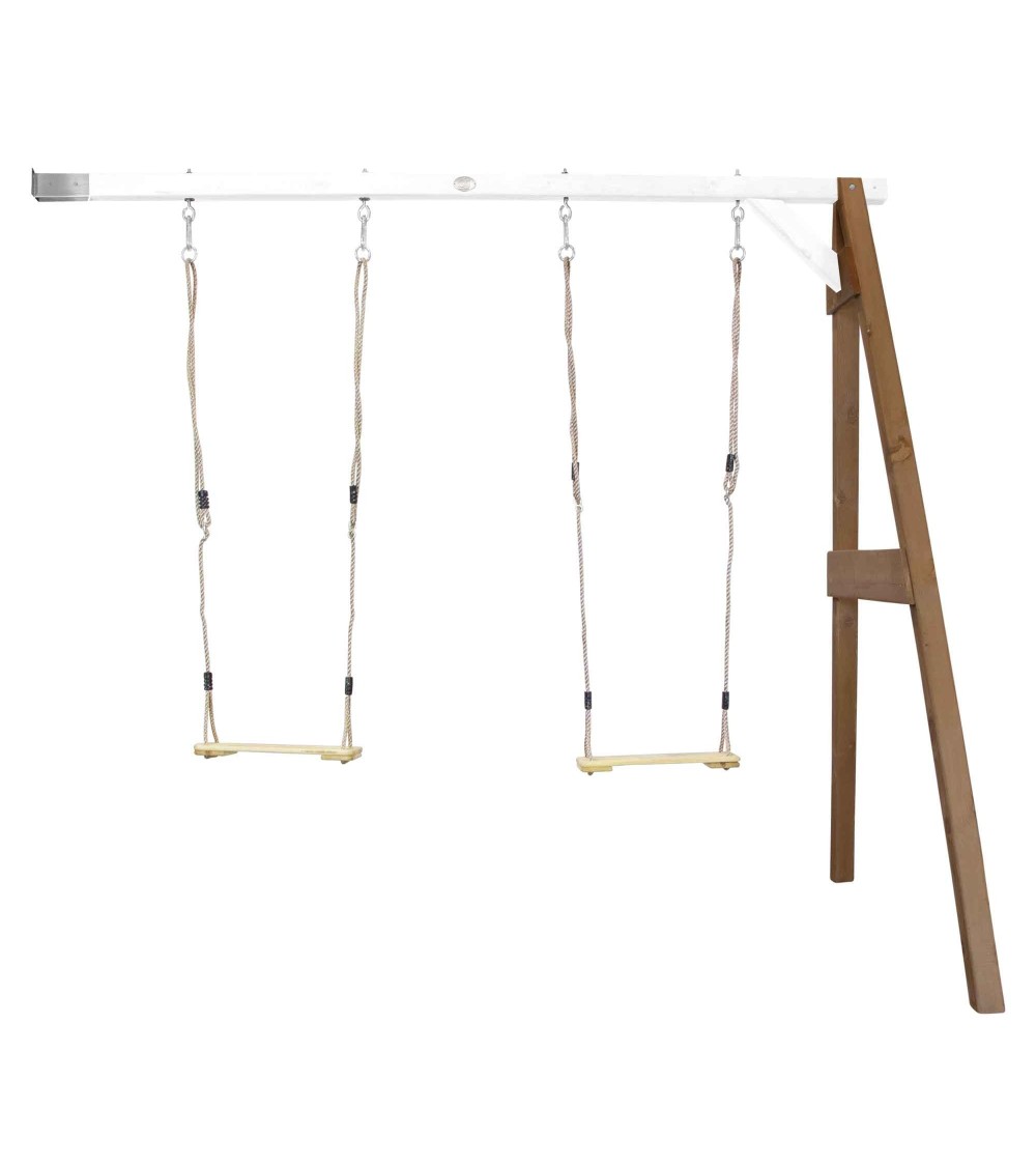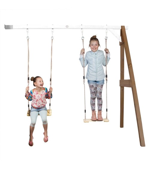 Portique mural avec 2 balançoires Wall Mount d'AXI fabriqué en bois de Hemlock. Ce bois ne se fendille pas et est naturellement résistant aux intempéries comme la pluie et donc à la pourriture du bois. Le portique mural est livré avec : - 2 balançoire en bois réglable en hauteur - 2 ancrages au sol pour plus de stabilité et de sécurité. - Bois de Hemlock FSC 100%. Bois non traité chimiquement traité par une teinture à base d'eau - Poids maximum supporté : 150 kg. - Cadre composé de poutres de 7 cm d'épaisseur - Dimensions (L x l x h): 160 x 171 x 207 cm - Poids : 21 kg - Assemblage facile. - Convient aux enfants de 3 ans et plus. - Garantie de 10 ans sur le bois par Axi