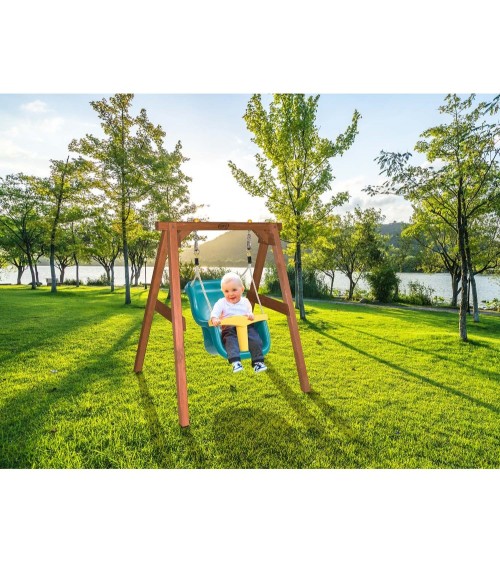 Le Portique bébé d'AXI est idéal pour initier les bébés et les tout-petits au plaisir en plein air. Ce Portique Bébé fournit un premier portique sûr et sécurisé. Apprendre à faire de la balançoire est une expérience formidable pour votre enfant. Elle développe leur équilibre, leur coordination et leur force. Le cadre du portique est uniquement construit en bois de Hemlock (pruche) robuste et durable, bois naturellement imputrescible, insensible aux champignons et insectes. Bois non-traité chimiquement, donc plus écologique et plus sur pour les enfants. Il est peint et traité avec un vernis aqueux. Livré avec des entretoises pour une stabilité supplémentaire. Ce bois s'intègre parfaitement à l'environnement naturel du jardin. Il comprend un siège de balançoire de luxe à dossier haut pour plus de confort. Barre en T avec 3 points d'appui et une sangle de sécurité supplémentaire pour une sécurité maximale. Inclus 4 ancres de sol pour bien fixer le portique. Poteaux de 6cm. Poids max conseillé: 70kg. Garantie 5 ans. De 9 mois à 3 ans. Dimensions au sol: 103 x 120 x H 134 cm. Poids: 29kg