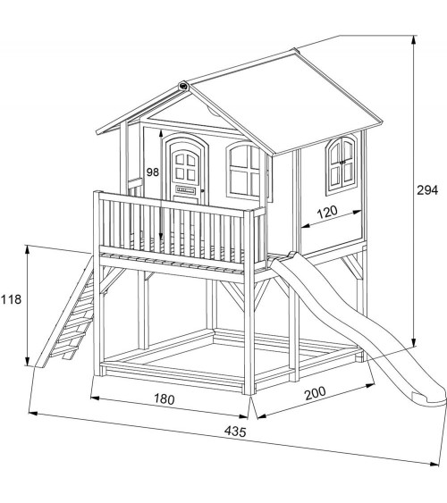 Marc est une grande cabane en bois pour enfant de la marque Axi avec un long toboggan et bac à sable. Dimensions totale (avec toboggan) : l : 200 cm x L : 435 cm x H : 294 cm. Longueur du toboggan : 220 cm. Bac à sable : 180 x 200 cm. Hauteur du plancher : 118 cm. Dimensions de la cabane : l : 120 cm x L : 180 cm x H : 175 cm.