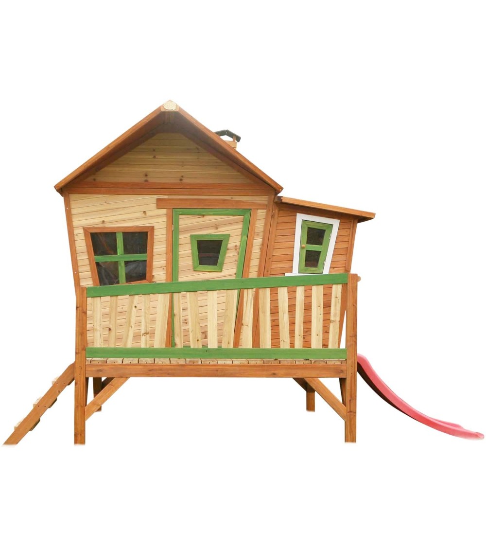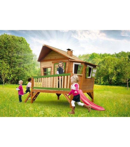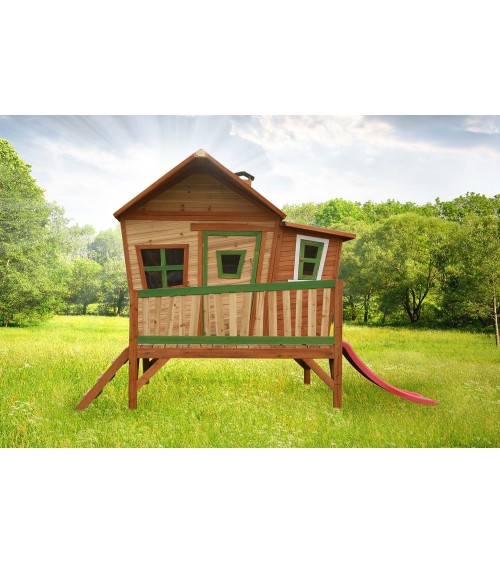 Cabane en bois pour enfant sur pilotis Emma de chez Axi équipée d'un escalier et d'un toboggan de 120 cm. Epaisseur des panneaux 15 mm, épaisseur du châssis : 38 mm. Maison en bois de cèdre asiatique naturellement imputrescible 100% bois FSC. Le set de fixation des pilotis est vendu séparément. Dimensions totale (avec toboggan) : l : 180 cm x L : 345 cm x H : 229 cm. Dimensions de la cabane : l : 120 cm x L : 180 cm x H : 174 cm.