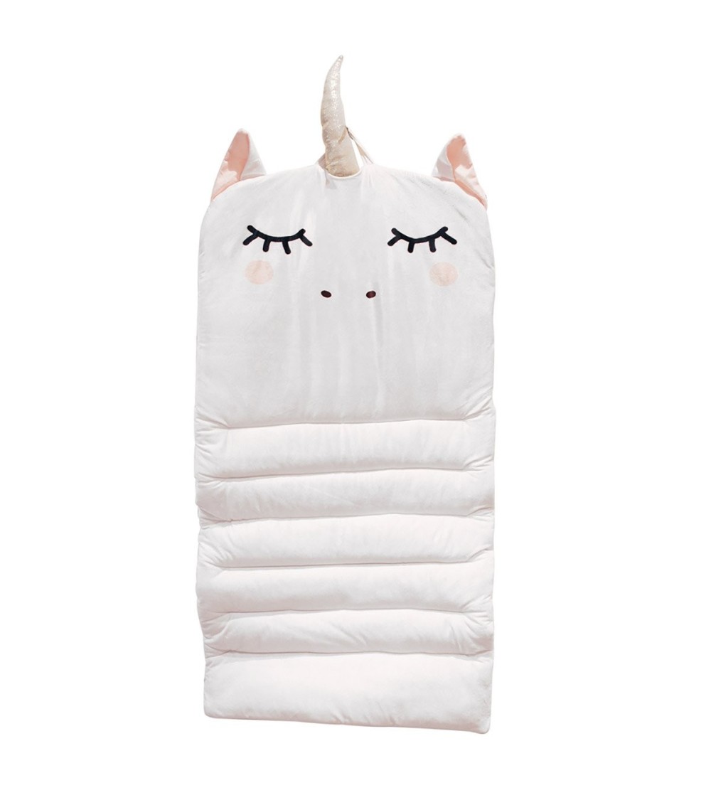 Pour faire de chaque nuit un enchantement, pour se relaxer devant un dessin animé, votre enfant sera heureux de se détendre dans ce tapis de sieste licorne. Bien rigolo avec sa corne !Informations sur le tapis de sieste licorne enfant :Dimensions : 140 x 60 cmComposition : 100% polyesterRoulable pour le ranger facilementCouleur : blanc et rose