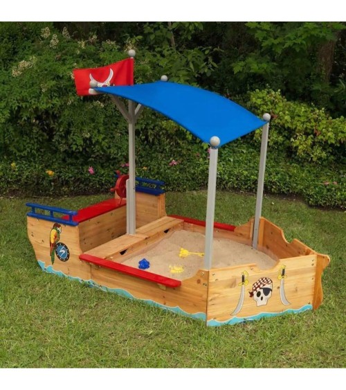 Aspect : Finitions : Résistant aux intempériesMatériau principal : Bois de SanmuDimensions : Hauteur (en cm) : 151,10Longueur (en cm) : 199,40Profondeur (en cm) : 112,40Autres caractéristiques : Age préconisé : De 3 à 10 ans.Composition : 1 bac à sable avec accessoires et décoration + 1 fond bac à sable + 1 housse bac à sable + 1 plastique transparent à placer sous le sable + 1 auvent de protection.Information complémentaire : Accessoires de jeu et sable non-inclus (nécessite environ 150 kg)Livré en kit : OuiMontage : Instructions de montage détaillées étape par étape.Poids (en kg) : 24,20 Paré à l'abordage ! Le bac à sable Bateau pirate offre aux moussaillons une aire de jeu pour revivre en toute liberté les aventures de Jack Sparrow ou du Capitaine Crochet.