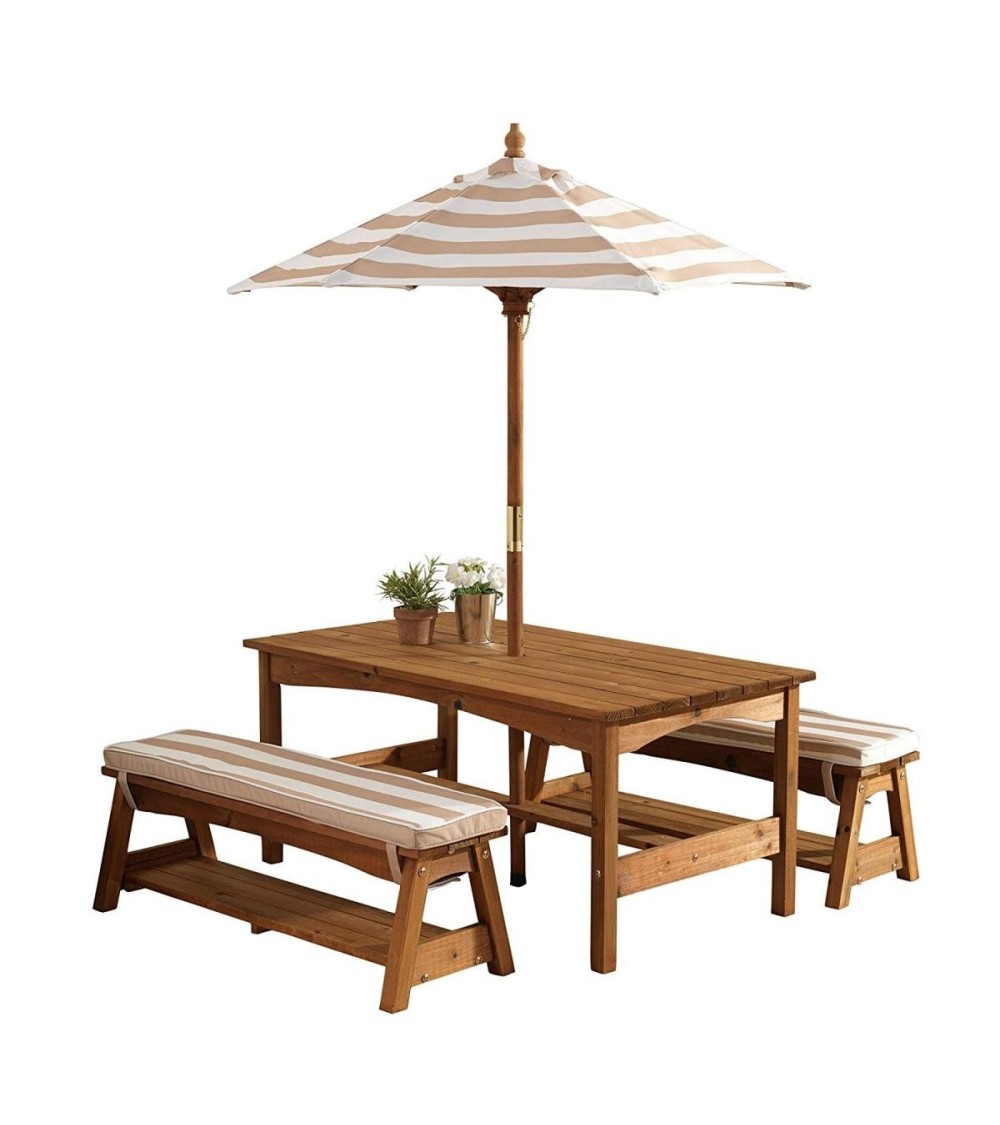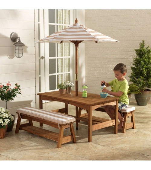 Ensemble table et bancs d'extérieur avec parasol enfant écru