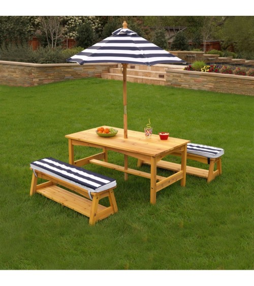 Ensemble table et bancs d'extérieur avec parasol enfant bleu