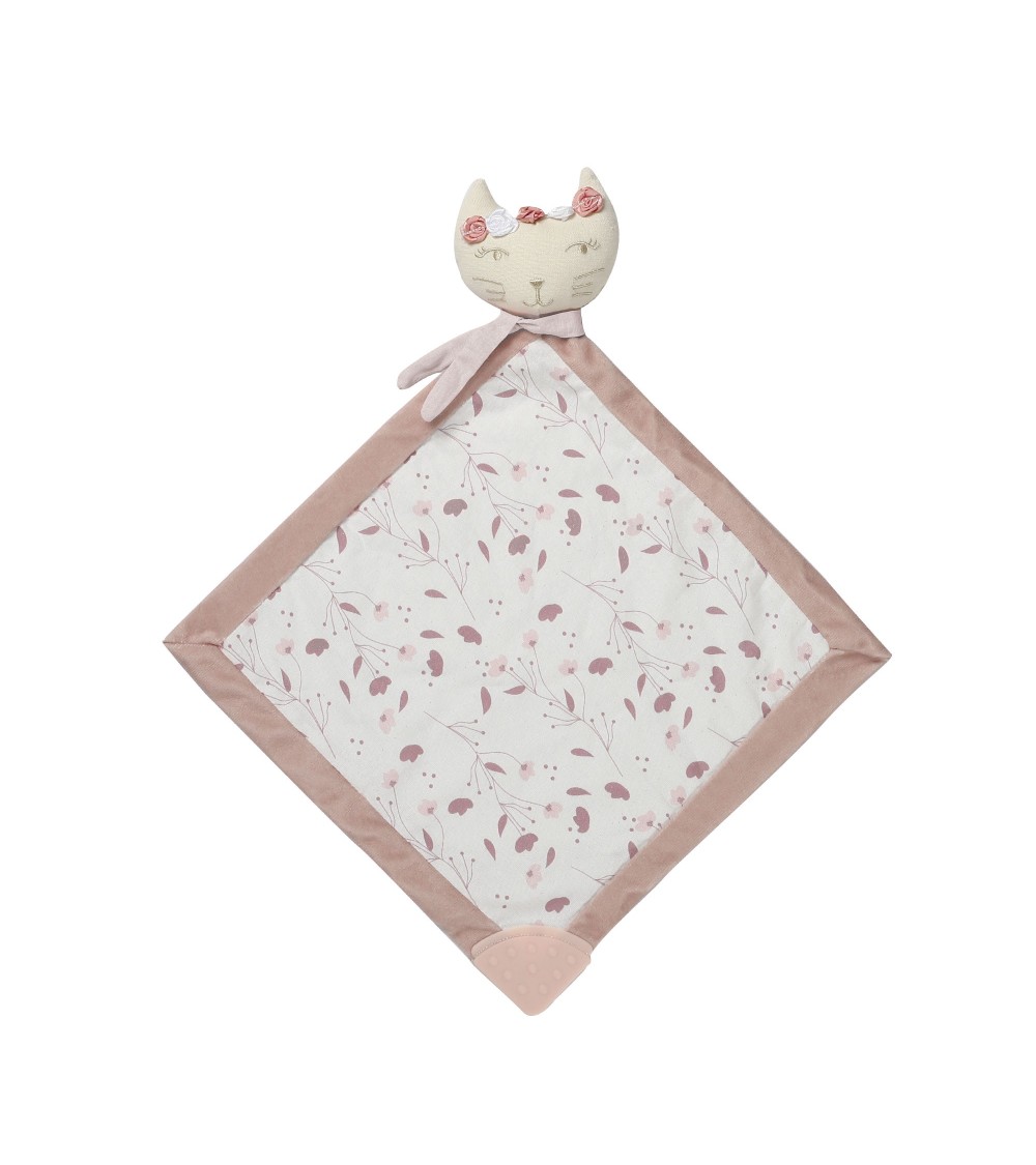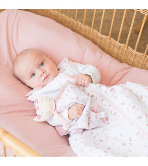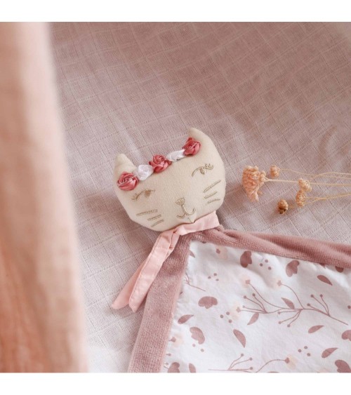 Ce doudou chat mesure 26x26 cm. Il est composé de plusieurs matières, 100% lin, 100% popeline de coton bio et velours (100% polyester) et offrira beaucoup de douceur à votre bébé.
