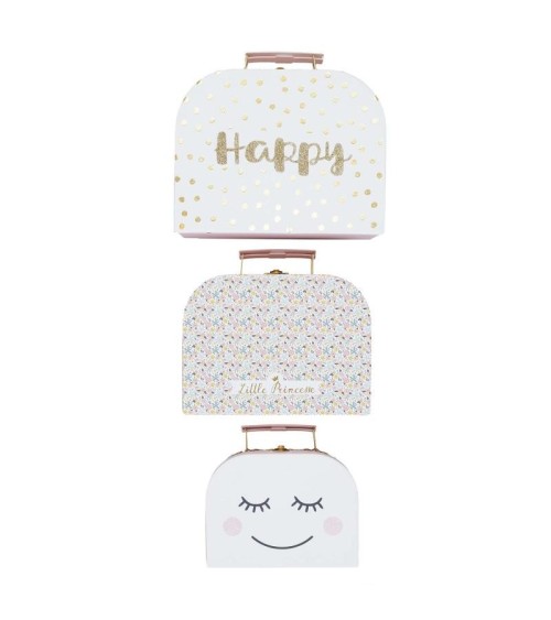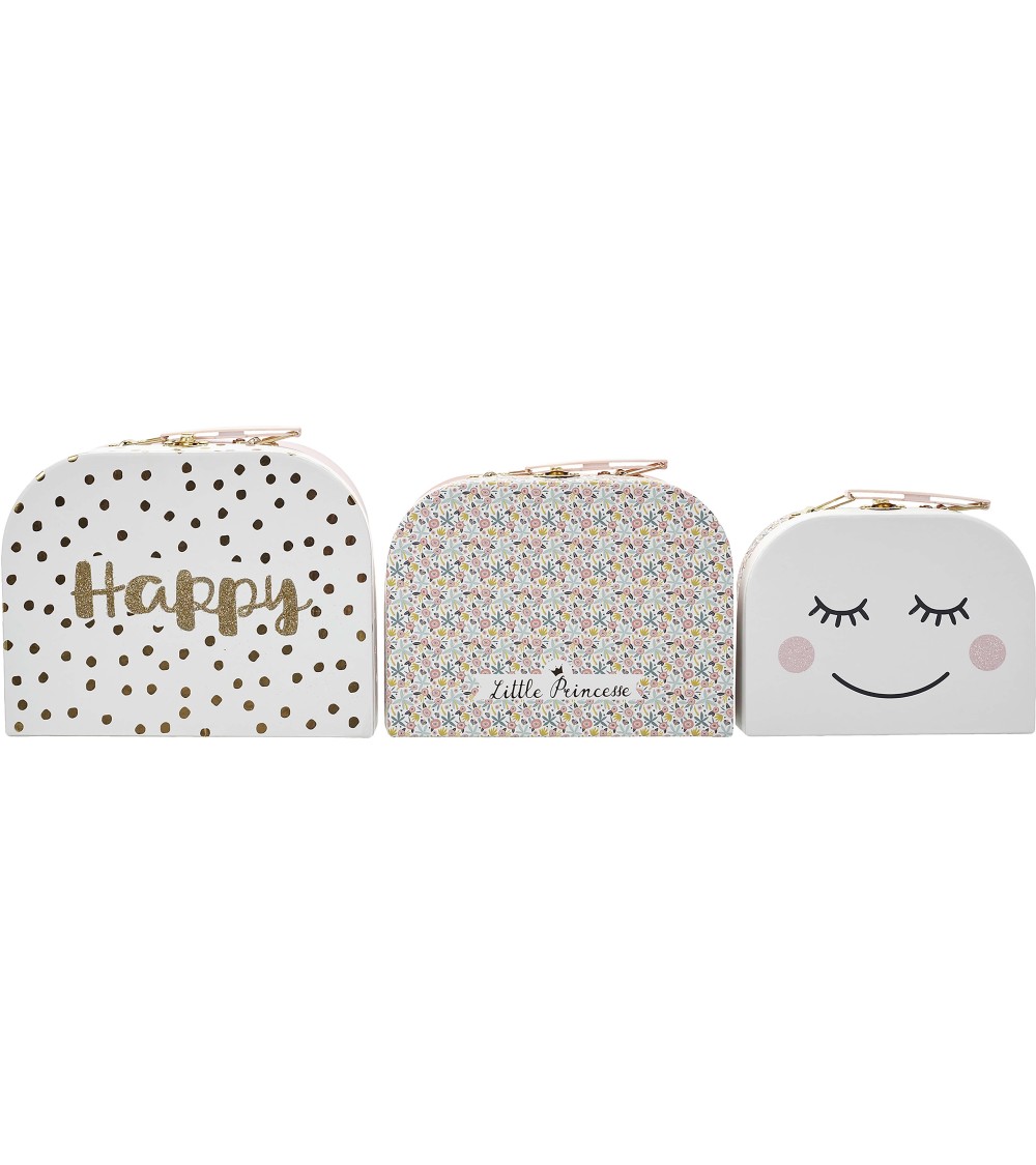 Aspect : Matériau principal : CartonDimensions : Hauteur (en cm) : 18Longueur (en cm) : 22Profondeur (en cm) : 6,30Autres caractéristiques : Composition : Set de 3 valisettes de tailles différentesPoids (en kg) : 0,19 Set de 3 valisettes de rangement pour enfants Happy