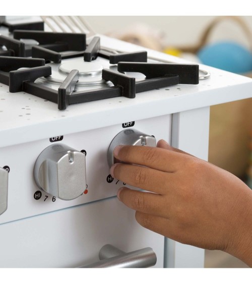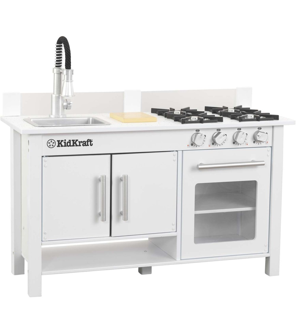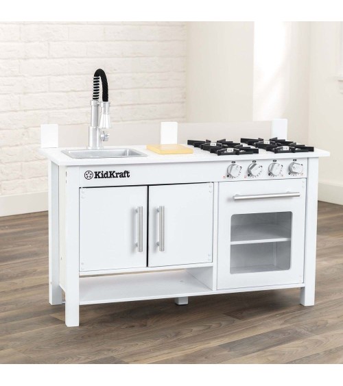 Aspect : Coloris : BlancMatériau principal : MDFMatériaux secondaires : Bois massif Plastique Dimensions : Hauteur (en cm) : 71,76Longueur (en cm) : 80,01Profondeur (en cm) : 30,48Autres caractéristiques : Age préconisé : 3 ans et +Informations complémentaires : Les portes du four et des placards s'ouvrent et se ferment Mini planche à découper Les boutons du four tournent et cliquent Evier amovible Poids (en kg) : 10,89 Cuisine enfant en bois Little Cook