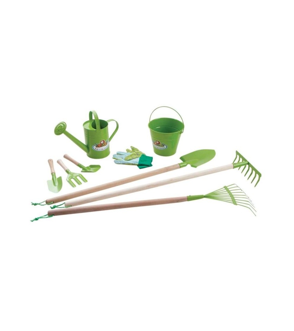 Aspect : Coloris : VertMatériau principal : Zinc (Outils)Matériaux secondaires : Bois FSCAutres caractéristiques : Avertissement : Déconseillé aux enfants de moins de 3 ansComprend : 1 pelle, 1 râteau, 1 râteau à feuilles, 1 arrosoir, 1 seau, 1 set de 3 petits outils (Pelle, râteau, transplantoir) et 1 paire de gantsPoids (en kg) : 2,52 Initiez les petits aux joies du jardinage avec ces 9 accessoires de jardin de chez Kids in The Garden! Confectionnés en zinc et en bois, leur durabilité est assurée !