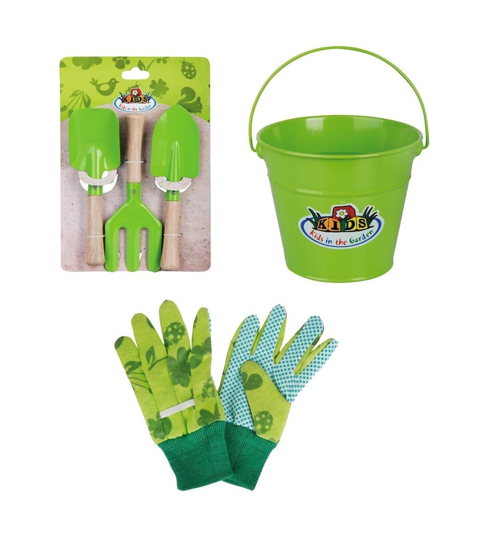 Kit petit jardinier accessoires pour enfant en métal seau + gants + pe