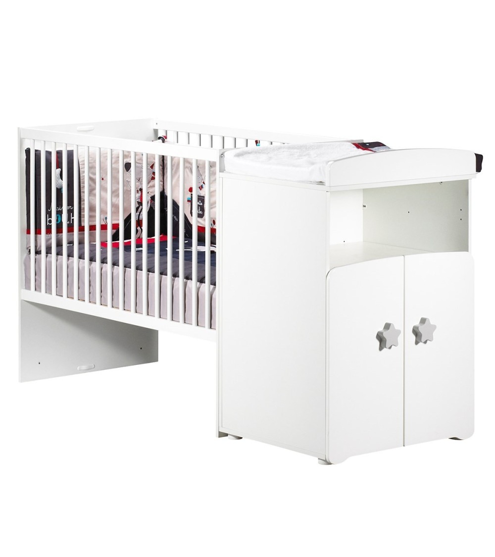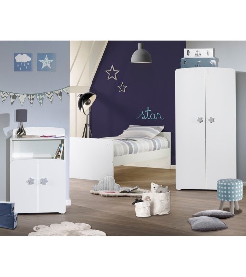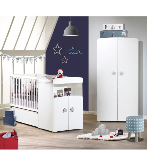 Lit bébé combiné évolutif 120x60 et 90x190 boutons étoile gris.L'ensemble se transforme en chambre junior : commode + lit 90x190 grâce aux longs pans de transformation inclus. Détails du produit :Panneau de MDF laqué blancPanneau de mélaminé blancGaleries en hêtre laqué blancSommier en hêtre brutBoutons étoiles en MDF laqués gris.Dimensions :Lit chambre transformable : L 179 x P 66 x H 100cmCommode : L66 x P 57 x H100 cmLit junior : L 194 x P 97 x H 66cmNormes et qualité :Le lit bébé 120x60 et la commode à langer peuvent être utilisés soit en bloc compact, soit dissociés l'un de l'autre (attention : la commode utilisée séparément n'est pas un meuble à langer).Galeries fixesSommier réglable en hauteur 3 positions.Fabrication française hormis galeries et sommier fabrication EuropeConforme à la norme NF EN 716 n1 & 2 (2008) + A1 février 2013 Conforme à la norme NF EN 12221 n1 & 2 (2008) + A1 octobre 2013Garanti sans solvant.En version bébé: Matelas non fourni.En version transformée : Matelas et sommier de lit non fournis, compatible avec un matelas et sommier de lit L190 x l 90.Conseils d'entretien :Dépoussiérage chiffon sec : ni alcool, ni solvant.Tâches rebelles : éponge légèrement humide.