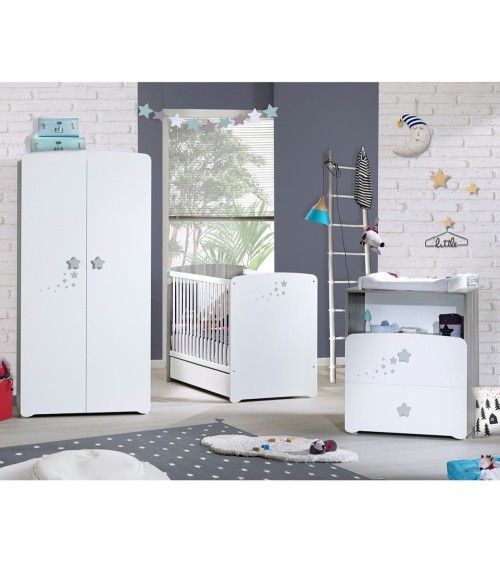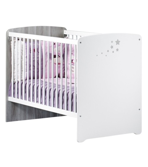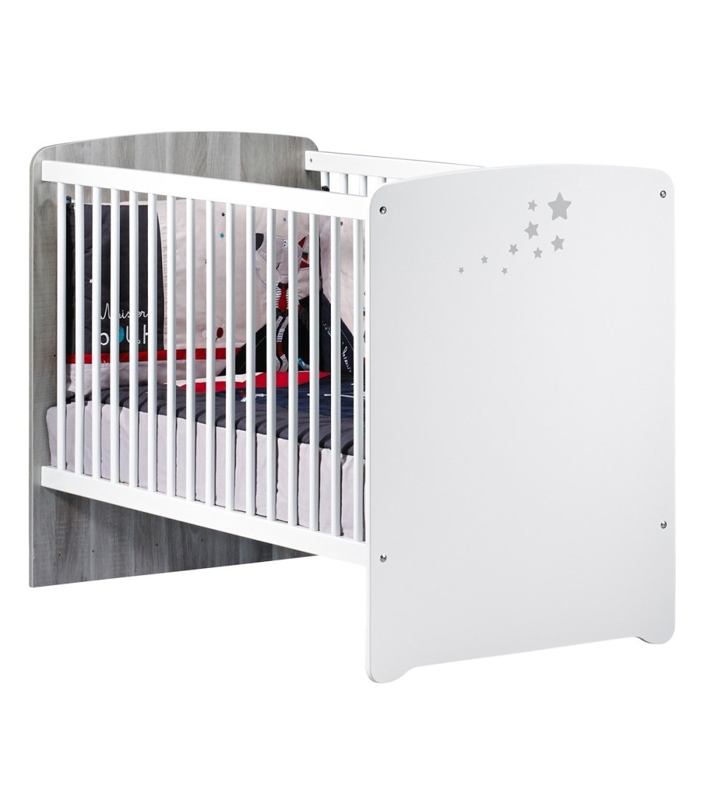 Une collection mixte et féérique parsemée d'étoiles, aux tons chêne silex, gris fumé et blanc.Décor ''étoile'' par sérigraphie, pour que bébé s'endorme sous une bonne étoile !Détails du produit :Panneau de fibres de moyenne densité (MDF) laqué blanc avec sérigraphie ''étoile'' gris fuméPanneau de particules décor papier chêne silexGaleries en hêtre laquées blancSommier hêtreDimensions en cm : L 123 x l 68 x H 90cmNormes et qualité :Conforme à la norme NF EN 716 n1 & 2 (2008) + A1 février 2013Garanti sans solvantPanneaux garantis avec une teneur en formaldéhydes <8mgTête et pieds de lit de fabrication française, galeries et sommier fabrication EuropeLit bébé 120x60 disposant de 2 galeries fixes et d'un sommier réglable en hauteur 3 positionsConseils d'entretien Dépoussiérage chiffon sec : ni alcool, ni solvant.Tâches rebelles : éponge légèrement humide.