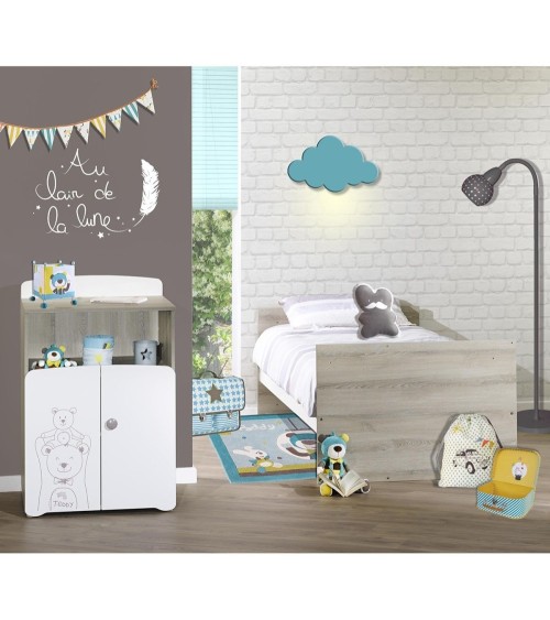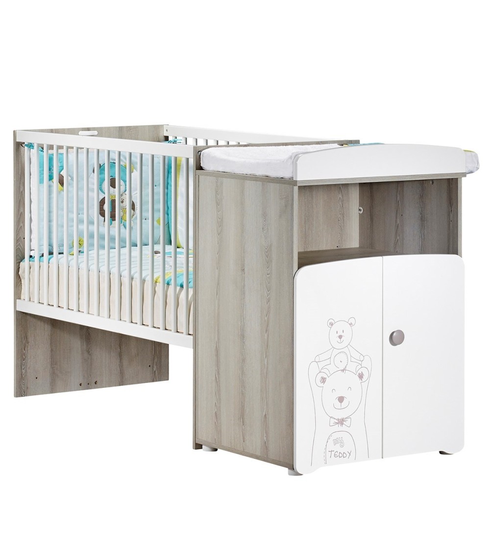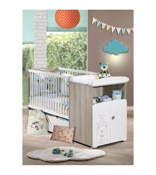Lit bébé combiné évolutif 120x60 en 90x190. Une collection mixte pleine de tendresse aux tons frêne cendré et blanc.A coup sûr, les deux ursidés veilleront sur les nuits de bébé !Détails du produit :Panneau de fibres de moyenne densité (MDF) laqué blanc avec sérigraphie ''Teddy''Panneau de particules décor papier frêne cendréPanneau de particules mélaminé blancGaleries en hêtre laqué blancSommier en hêtre brut4 pieds ronds blancsBouton laqué taupe naturel.Dimensions en cm : 120x60x100cmNormes et qualité :Le lit bébé 120x60 et la commode à langer peuvent être utilisés soit en bloc compact, soit dissociés l'un de l'autre (attention : la commode utilisée séparément n'est pas un meuble à langer).L'ensemble se transforme en commode ainsi qu'en véritable lit junior 90x190 grâce aux longpans de transformation inclusGaranti sans solvant.Panneaux garantis avec une teneur en formaldéhydes <8mgEn version bébé: Matelas non fourni.En version transformée : Matelas et sommier de lit non fournis, compatible avec un matelas et sommier de lit L190 x l 90Fabrication française, hormis galeries et sommier fabrication EuropeConseils d'entretien :Dépoussiérage chiffon sec : ni alcool, ni solvant.Tâches rebelles : éponge légèrement humide.