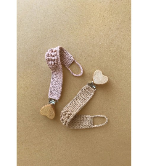 Attache-sucette en crochet Patti OsloPour ne pas perdre la sucette préférée de bébé choisissez cette jolie attache-sucette en crochet.Un design classique dans des couleurs tendances !Chaque article est livré dans un joli petit sac en coton, c'est le cadeau idéal pour une naissance !PATTI OSLO est une marque norvégienne qui propose des jouets et accessoires entièrement crochetés et brodés à la main. Tous les produits sont fabriqués en coton bio par des femmes artisanes indépendantes qui utilisent des techniques traditionnelles.En choisissant les produits Patti Oslo vous contribuez à donner un revenu équitable à ces femmes talentueuses.Fabriqués éthiquement en Turquie.Dimensions23 cmComposition / MatièreFabriqué en coton bio certifié GOTS, teint naturellement à base de plantes, antibactérien et hypoallergénique.Coeur en bois d'érable.EntretienUtilisez toujours un détergent doux et de l'eau froide pour nettoyer les taches.Faire sécher à plat.NormesConforme à la norme EN-71Âge conseillé0+AvertissementRetirez l'emballage et toutes les étiquettes avant utilisationVérifiez et nettoyez le produit avant de le donner à votre enfant.