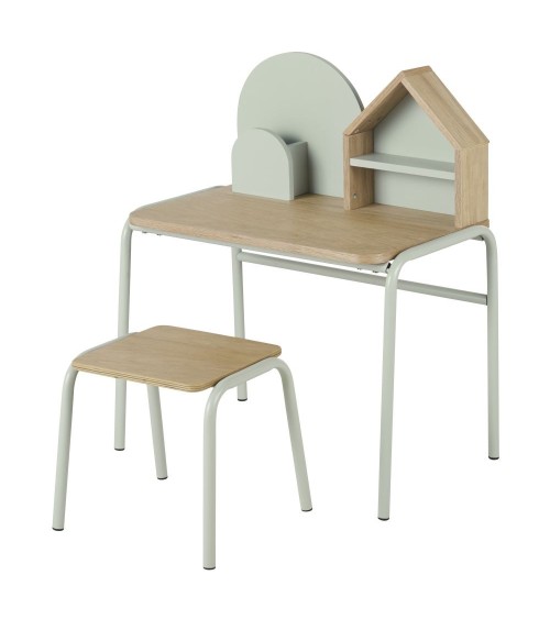 Pour un espace de travail mignon et optimal, optez pour le set bureau et chaise coloris vert et naturel ORESTAD. Ce petit bureau taille enfant original en forme de petite maison, est équipé de rangements sur le plateau et d'un pot à crayon. Il est optimal pour ceux qui sont prêts à faire parler leur créativité ! Son côté pratique : l'assise taille enfant qui accompagne le bureau. L'ensemble vert et coloris bois ira avec tous les styles de déco et vous pourrez facilement l'installer dans toute chambre d'enfant.