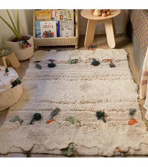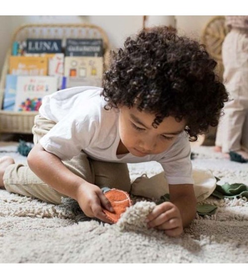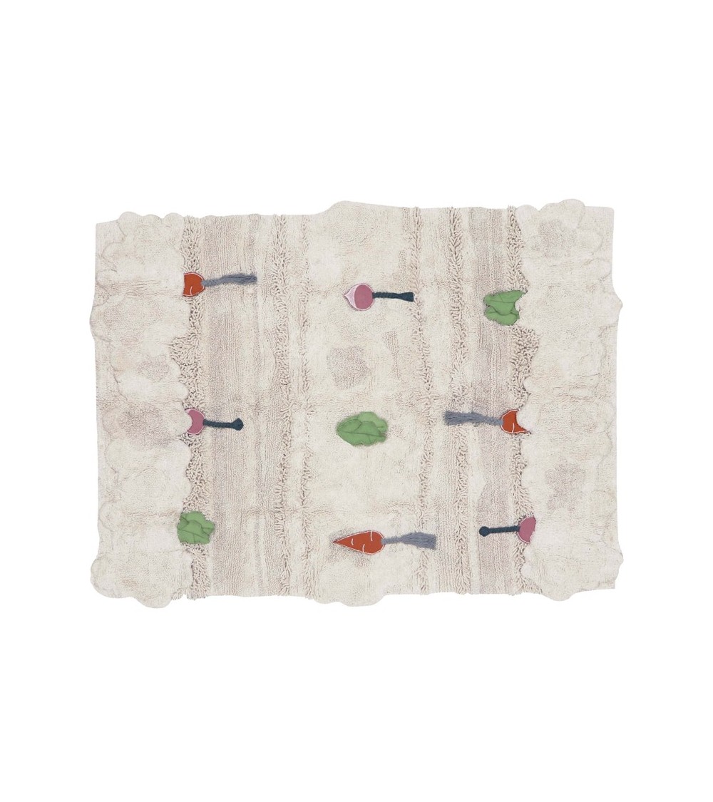 Ce tapis texturé beige, sert à la fois de décoration et à la fois de tapis de jeu pour une chambre d'enfant. Avec le tapis 15 légumes en tissus sont fournis - carottes, radis, feuille de kale - à cacher dans les reliefs du tapis qui représente un lopin de terre. Succès garanti auprès des enfants ! Il est fait main et est fabriqué en coton. Il est réalisé avec des colorants non toxiques. Chaque pièce est unique, il peut donc y avoir de petites variations de couleur et de forme. Certifié 18001, 14001, ISO 9001, il respecte toutes les normes de sécurité. Le plus de ce tapis : il est lavable en machine ! Le tapis est livré avec un antidérapant à positionner sous le tapis. Le tapis Washable Veggie Garden fait partie de la collection capsule de Oli&Carol et Lorena Canals. Il est dessiné en Espagne et fabriqué à la main en Inde au sein de l'usine de la marque. Lorena Canals est une entreprise éco-responsable créée il y a plus de 20 ans qui propose des tapis pour l'ensemble de la maison. Les tapis sont uniquement réalisés avec des matières et des teintures naturelles, tissés à la main. Livrable sous 1 ou 2 semaines. Dimensions du tapis : 120 x 160 cm.