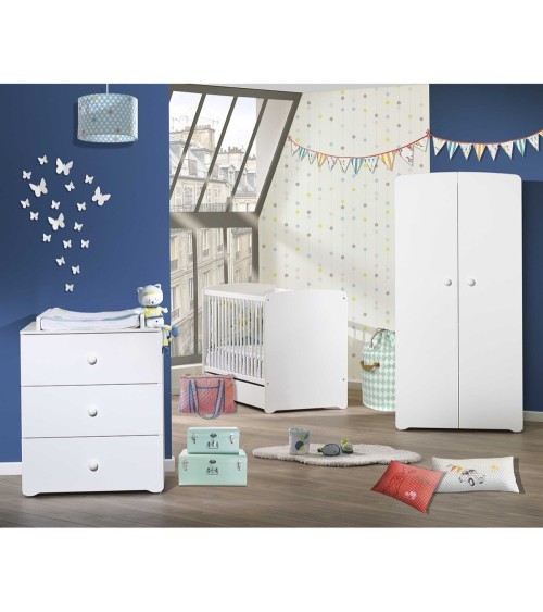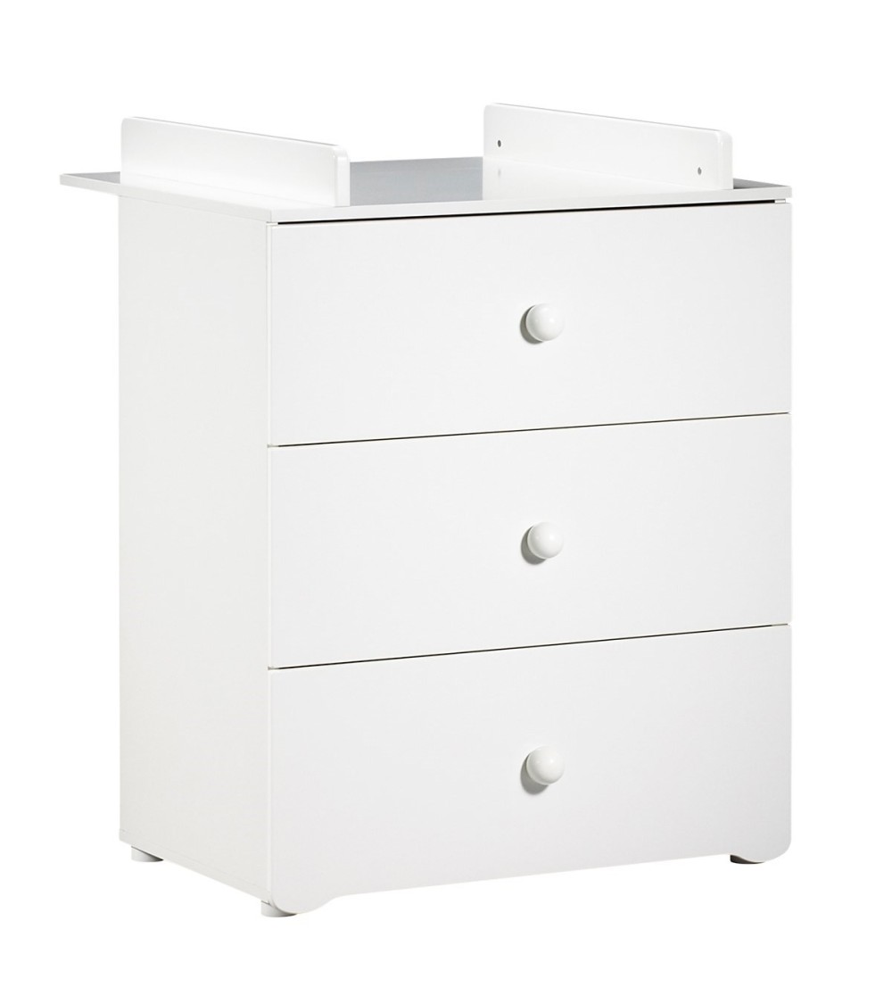 Commode 3 tiroirs boutons ''boules'' blanc avec dispositif à langer (amovible) inclus.Détails du produits :Panneau mélaminé blancPanneau de fibres de moyenne densité (MDF) laqué blancPanneau de fibres dures blancBoutons ronds en hêtre laqués blanc.Dimensions en cm : L 76 x l 66 H 97Normes et QualitéGarantie sans solvant.Panneaux garantis avec une teneur en formaldéhydes <8mgConforme à la norme NF EN 12221 n1 & 2 (2008) + A1 octobre 2013Fabrication française.Conseils d'entretien :Dépoussiérage chiffon sec : ni alcool, ni solvant.Tâches rebelles : éponge légèrement humide.