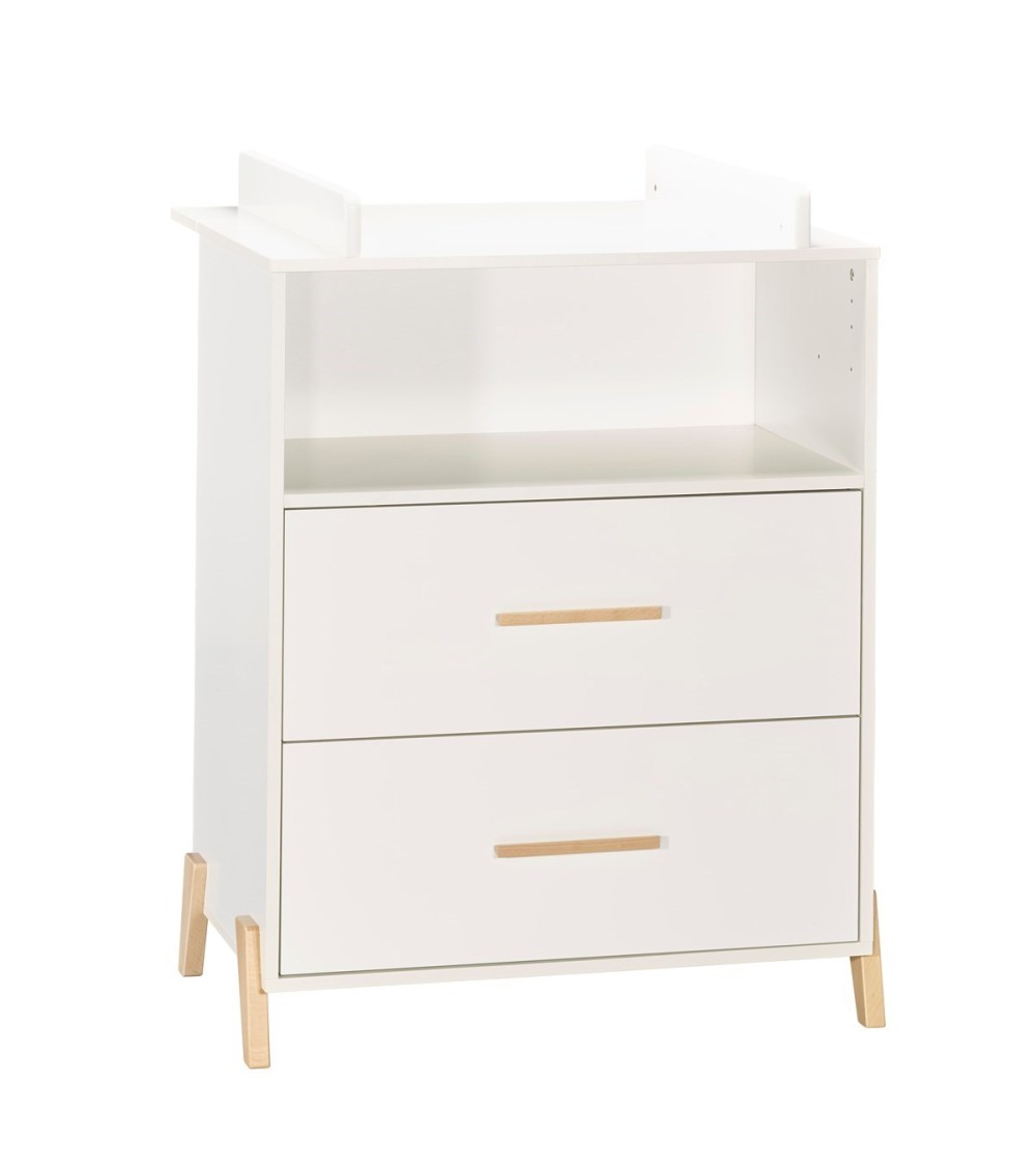 La commode à langer JOY de style scandinave est idéal pour une chambre de bébé sobre et tendance.La commode combine modernité et fonctionnalité. Elle possède 2 grands tiroirs et une grande niche pour vous permettre de ranger l'essentiel des affaires de bébé.Vous pourrez ainsi changer bébé en toute sécurité jusqu'à ses 11 kg en ayant l'essentiel à portée de main.Détails du produit:Dessus, traverse arrière dispositif à langer, dessous, cotés, tablette niche en panneaux de particules mélaminés décor blanc.Faces tiroirs en panneaux de particules mélaminés décor blanc, chants blancs, et laquées 1 face Blanc.4 pieds et 2 poignées en hêtre laqués gris foncé.2 joues du dispositif à langer en panneaux de fibres de moyenne densité (MDF) laquées blanc.Dimensions:76 x 103 x 66cmDimensions utiles dispositif à langer: 68x52cmNormes et Qualité :Fabrication française, hormis pieds fabrication EuropeConforme à la norme de sécurité: NF EN 12221 1&2 (version juillet 2008) + A1 (version 2013)Panneaux garantis avec une teneur en formaldéhyde de 4 mg/100gGaranti sans solvantLaque hydro_ Norme jouet 71/3Afin d'utiliser la commode en toute sécurité, elle doit être fixée au mur; sangle fournie.Le dispositif à langer est utilisable jusqu'aux 11 kg de l'enfant.Meuble à monter soi-mêmeConseils d'entretien:Dépoussiérage chiffon sec : ni alcool, ni solvant.Tâches rebelles : éponge légèrement humide.Sauthon, entreprise française spécialiste de la puériculture développe pour vous des chambres de bébé depuis 1948!