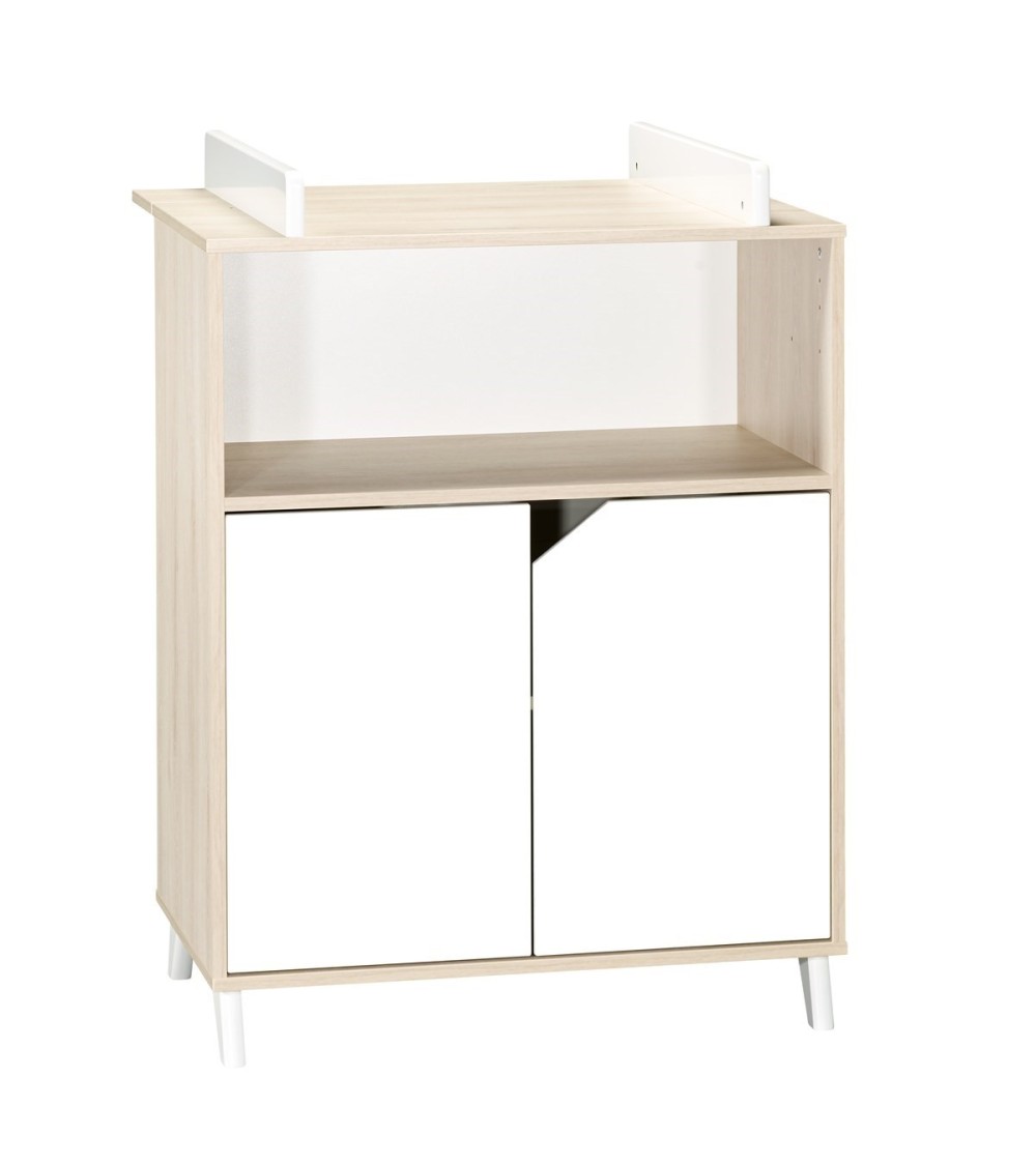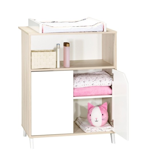 Cette commode à langer aux lignes scandinave combine fonctionnalité et simplicité. Elle est équipée de deux portes, d'une niche et d'un dispositif à langer amovible.Vous pourrez ainsi changer bébé en toute sécurité jusqu'à ses 11 kg en ayant l'essentiel à portée de main.Détails du produit:Dessus, traverse arrière du dispositif à langer, dessous, cotés, tablette niche en panneaux de particules enrobés papier décor gris loft.1 tablette intérieure en panneaux de particules mélaminés décor blanc.Portes en panneaux de fibres de moyenne densité (MDF) laquées blanc.4 pieds en hêtre laqués blanc.2 joues du dispositif à langer en panneaux de fibres de moyenne densité (MDF) laquées blanc.Normes et Qualité :Fabrication française, hormis pieds fabrication EuropeConforme à la norme de sécurité: NF EN 12221 1&2 (version juillet 2008) + A1 (version 2013)Panneaux garantis avec une teneur en formaldéhyde de 4 mg/100gGaranti sans solvantLaque hydro_ Norme jouet 71/3Afin d'utiliser la commode en toute sécurité, elle doit être fixée au mur; sangle fournie.Le dispositif à langer est utilisable jusqu'aux 11 kg de l'enfant.Meuble à monter soi-mêmeDimensions:76 x 103 x 66cmDimensions utiles dispositif à langer: 68x52cmConseils d'entretien:Dépoussiérage chiffon sec : ni alcool, ni solvant.Tâches rebelles : éponge légèrement humide.Sauthon, entreprise française spécialiste de la puériculture développe pour vous des chambres de bébé depuis 1948!