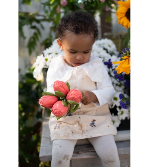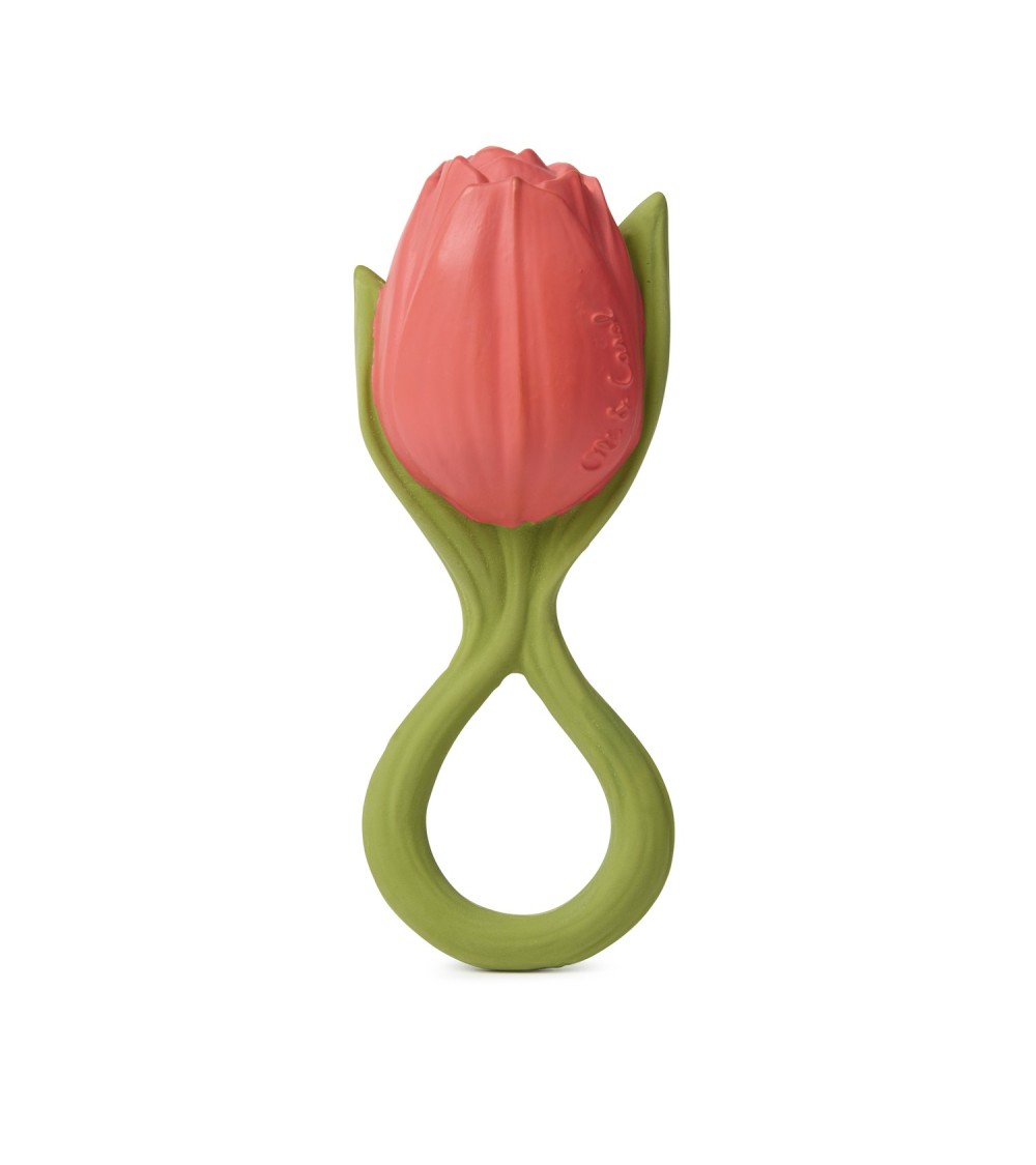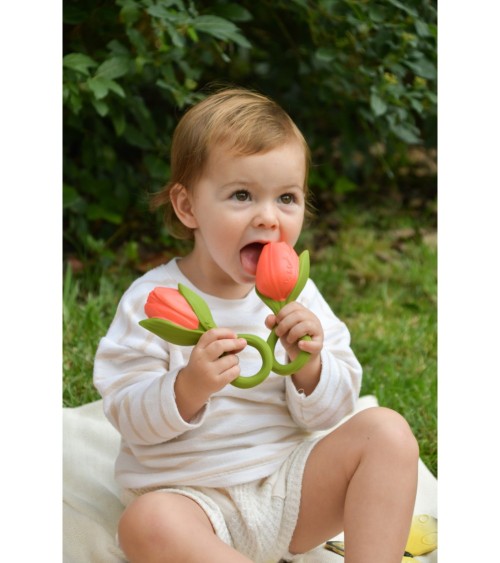 Anneau de dentition Theo la tulipe Oli & CarolLes enfants adoreront le volume de la fleur à manipuler et sa tige en forme d'anneau qui permet de la mâchouiller !Theo la tulipe est aussi bien un anneau de dentition qu'un jouet de bain pour bébé.Jouet en caoutchouc 100 % naturel provenant de l'hévéa, l'arbre à caoutchouc. Fabriqué et peint à la main avec des pigments naturels. Chaque pièce étant unique, la forme et la couleur peuvent varier d'un jouet à l'autre. Doux et souple, facile à saisir et à mâcher. Stimule les sens du bébé et apaise les gencives pendant les poussées dentaires.Totalement hygiénique et antibactérien, sans orifice, pour empêcher la formation de moisissure. Un jouet écologique, sans danger et conforme aux réglementations internationales pour les produits pour enfants. Socialement responsable Oli&Carol apporte son grain de sable en collaborant à divers projets à caractère social.Dimensions14 x 5.5 x 5 cmComposition / MatièreCaoutchouc 100% naturelEntretienNettoyez le jouet avec de l'eau, du savon et un chiffon humide.Ne le stérilisez pas et ne le conservez pas au réfrigérateur.Gardez le jouet dans un endroit sec. Comme tout autre produit naturel, il peut moisir s'il est laissé dans un endroit humide pendant de longues périodes. Il est recommandé de le faire sécher à l'air libre entre deux utilisations.Ne laissez pas le jouet en contact direct avec la lumière du soleil ou toute lumière artificielle pendant de longues périodes, car la couleur peut s'estomper.Nos jouets sont 100% naturels, donc les petites imperfections ou incohérences sont normales.Les variations de température peuvent affecter la forme et le volume du produit.NormesEN71, ASTM et Reach.Âge conseillé0+AvertissementRetirez l'emballage et toutes les étiquettes avant utilisationVérifiez et nettoyez le produit avant de le donner à votre enfant.