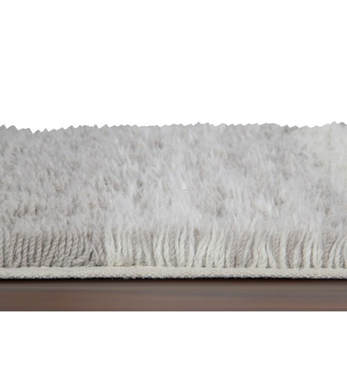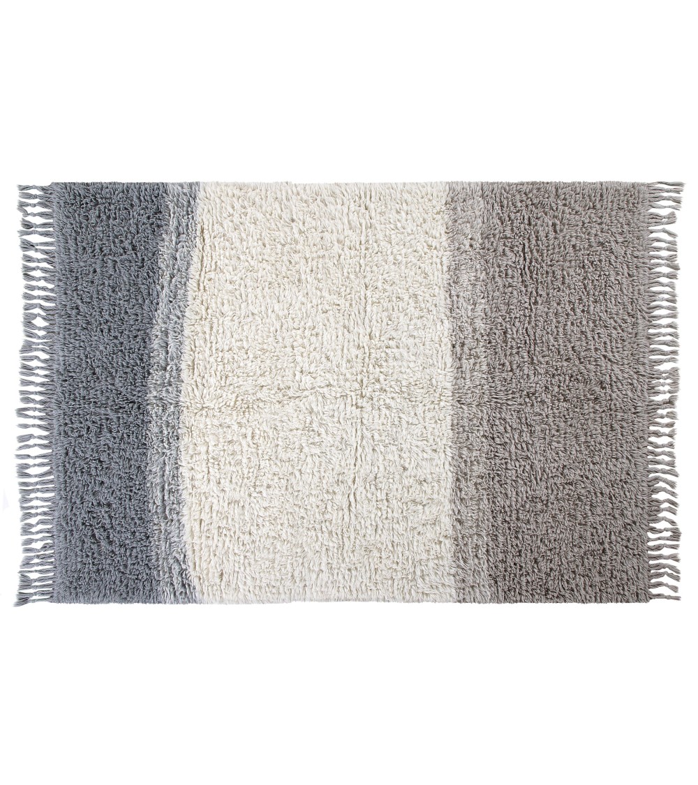 Tapis rectangulaire en laine à poils moyens dans des tons doux de bleu fumé, naturel et gris argenté. Fini avec des franges de laine nouées à la main sur les bords. Un sac fourre-tout en coton et une sous-couche antidérapante sont inclus avec chaque tapis.