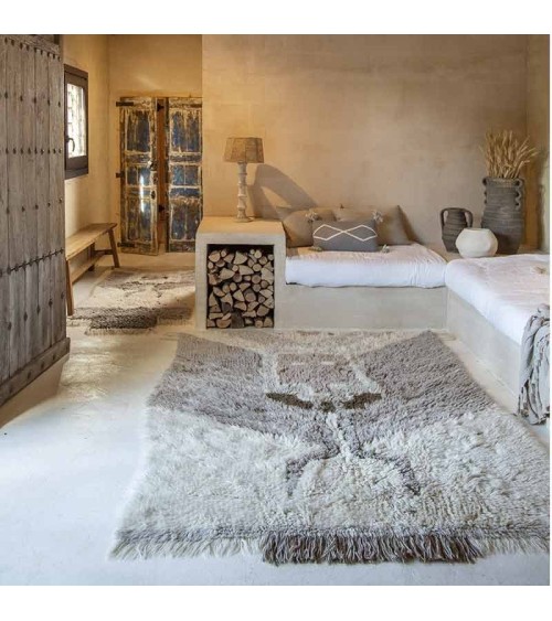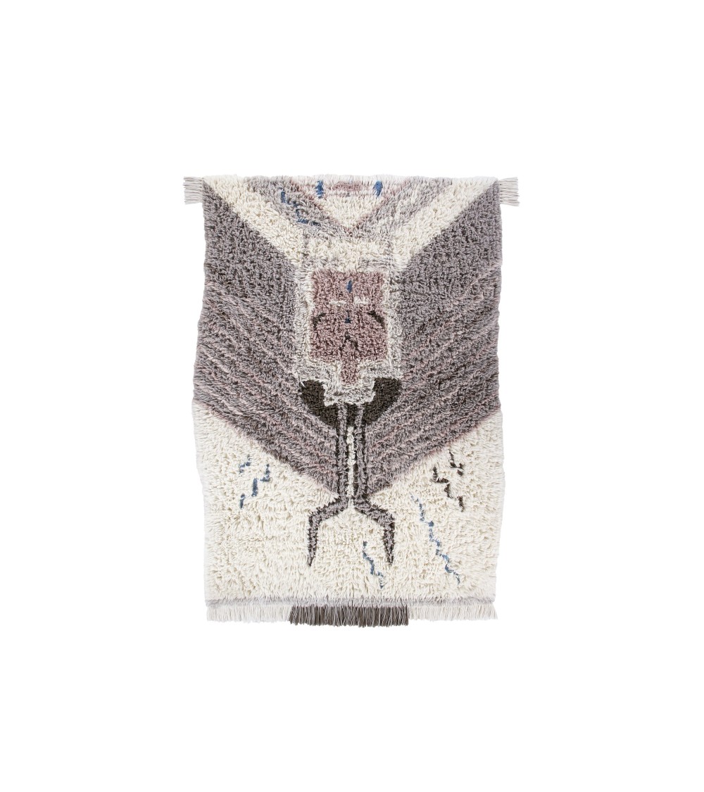 Inspiré des anciennes traditions artisanales des tribus Hopi, un tapis de forme irrégulière avec des poils de laine longs et moyens moelleux dans des combinaisons de couleurs douces. Fini avec des franges en laine désordonnées à un nud dans des couleurs mélangées. Un sac fourre-tout en coton et une sous-couche antidérapante sont inclus avec chaque tapis.