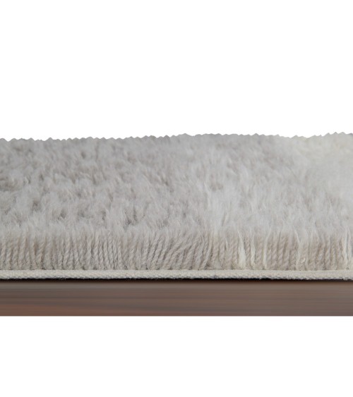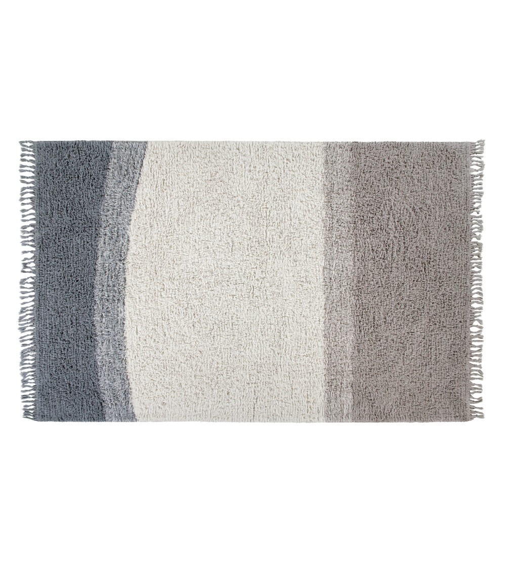 Tapis rectangulaire en laine à poils moyens dans des tons doux de bleu fumé, naturel et gris argenté. Fini avec des franges de laine nouées à la main sur les bords. Un sac fourre-tout en coton et une sous-couche antidérapante sont inclus avec chaque tapis.