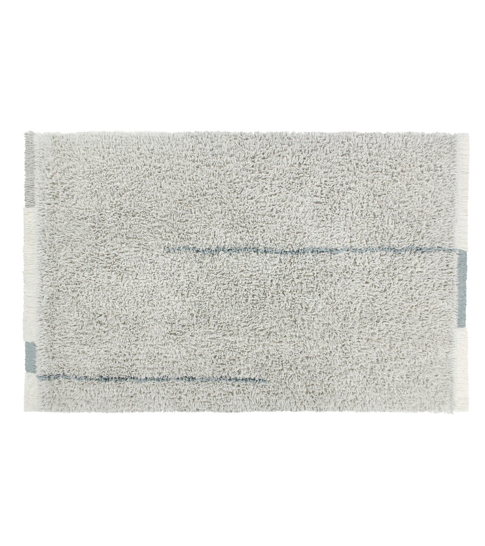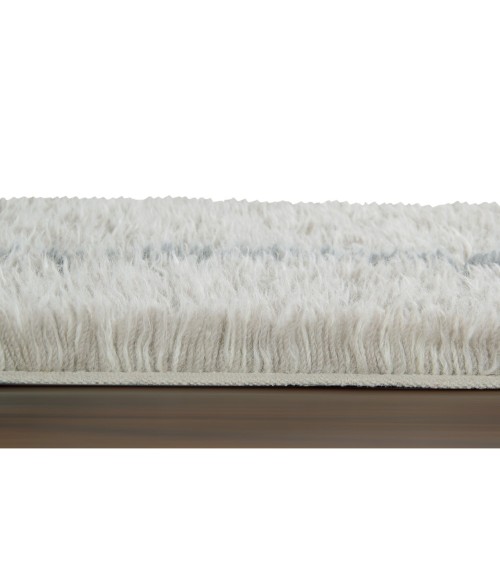 Un tapis en laine rectangulaire à poils longs et moelleux, de couleur naturelle mélangée à du gris argenté et avec des lignes contrastées en bleu fumé. Des franges inégales sur les bords donnent au tapis un look bohème et hippie. Un sac fourre-tout en coton et une sous-couche antidérapante sont inclus avec chaque tapis.