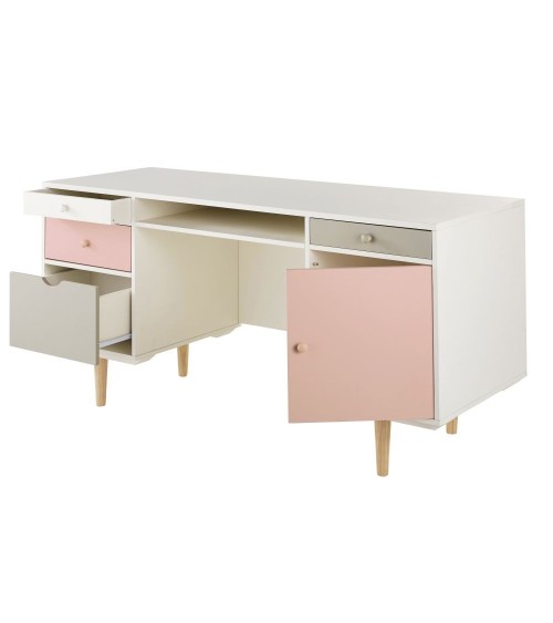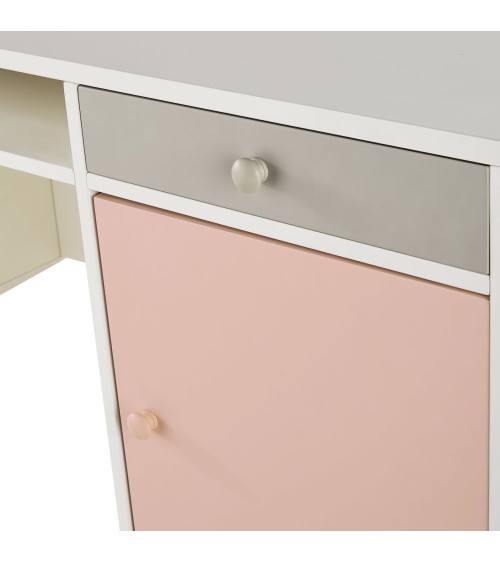 Bureau 1 porte 4 tiroirs blanc, gris et rose