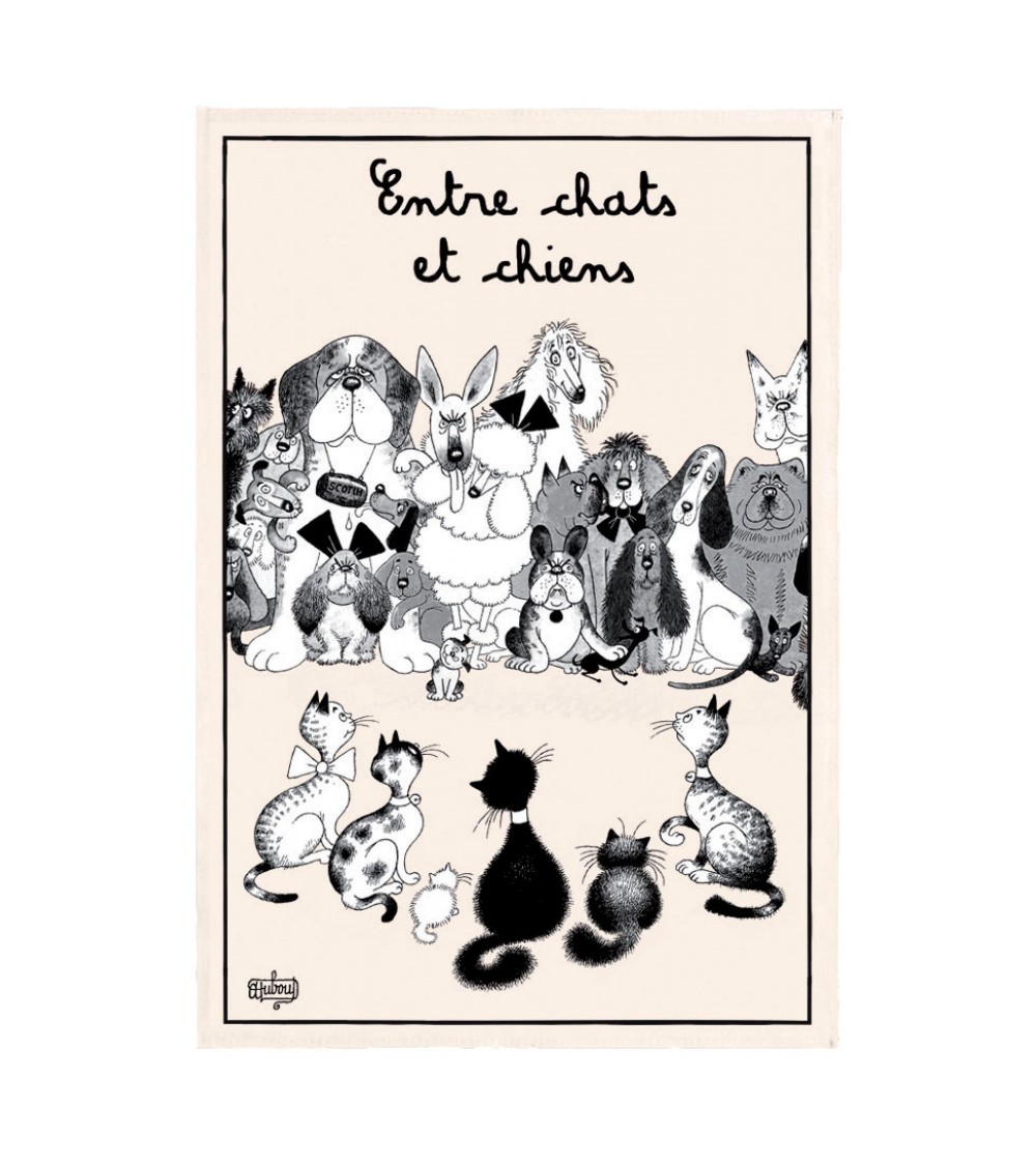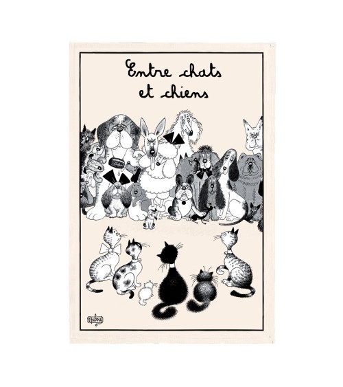Torchon dubout entre chats et chiens en coton écru 48 x 72