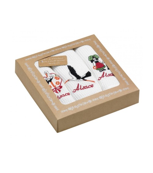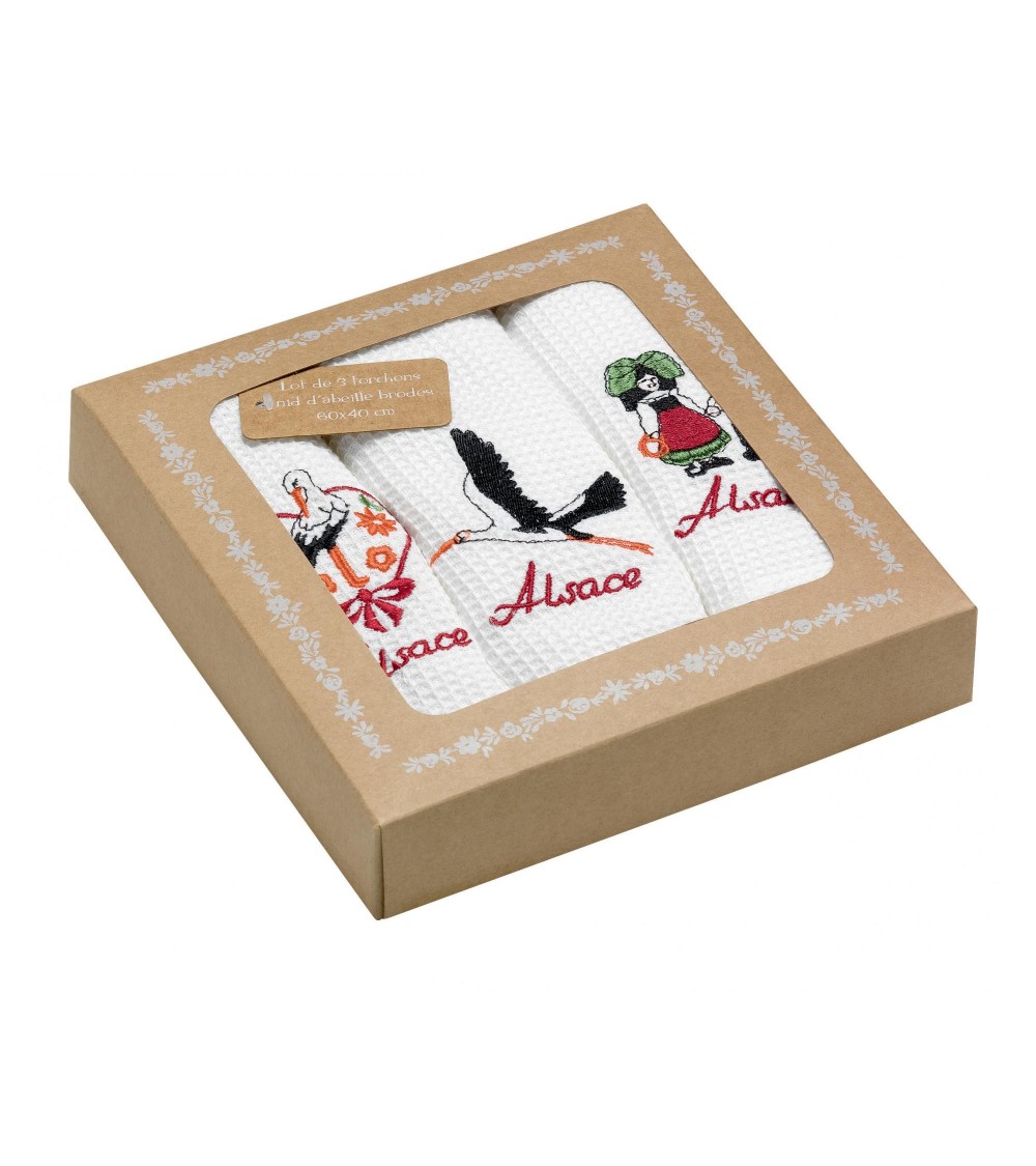 Lot de 3 torchons nid d'abeilles alsace brodés blanc 40 x 60