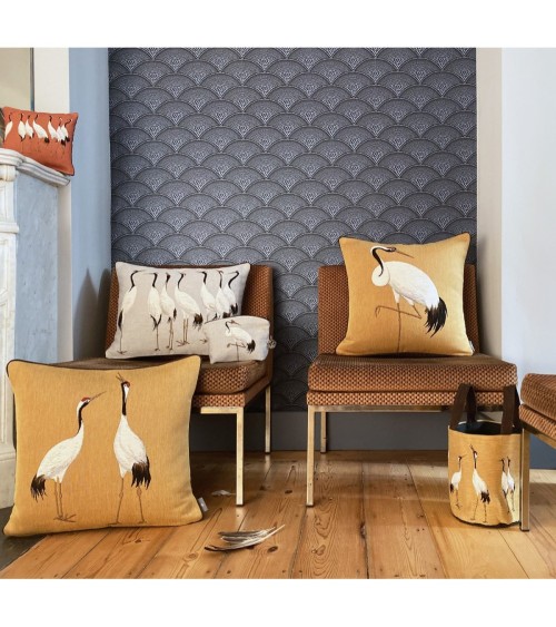 Coussin tapisserie Une grue blanche. Ce coussin avec cette grue blanche se prépare à faire une petite sieste sur votre canapé. Créé, tissé et confectionné dans nos ateliers selon le savoir faire de la tapisserie, sur un métier Jacquard traditionnel composé de plus de 14 000 fils ! Composition - 72 pour cent Coton . 25 pour cent Viscose . 3 pour cent Polyester. Coussin tapisserie tissé en France Entretien - Lavage à sec Dimensions - L - 50 x 50 cm. Ouverture - Fermeture éclair. Le coussin est fourni avec son intérieur (garnissage inclus).