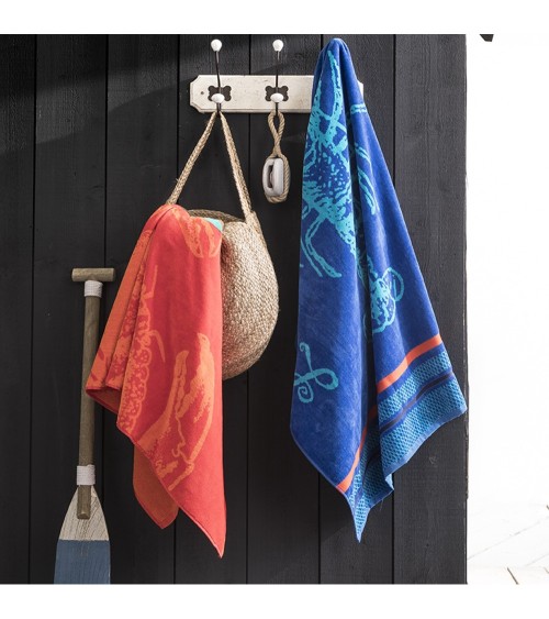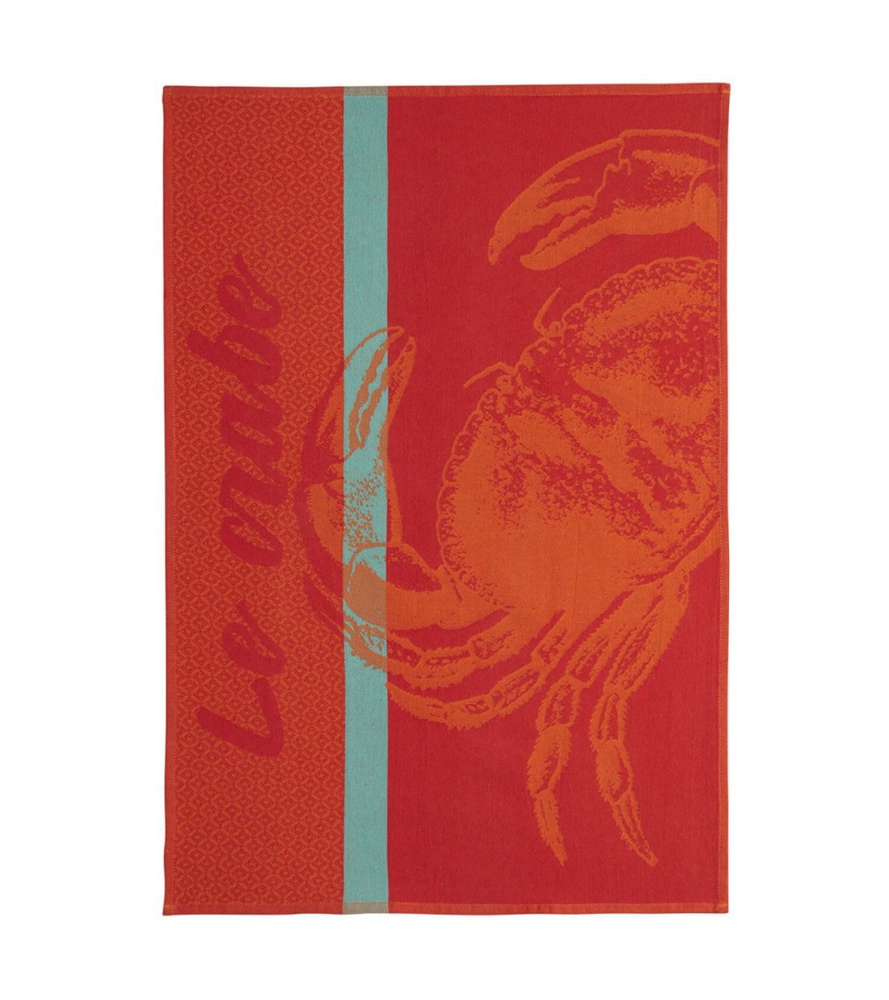 Ce torchon en jacquard de coton abore un magnifique crabe. Dans des tons de orange qui lui sont propres, il arbore une fine bande de bleu turquoise. Matière - jacquard de coton