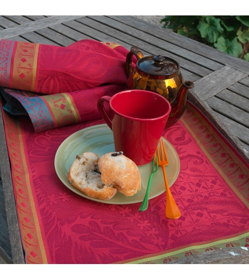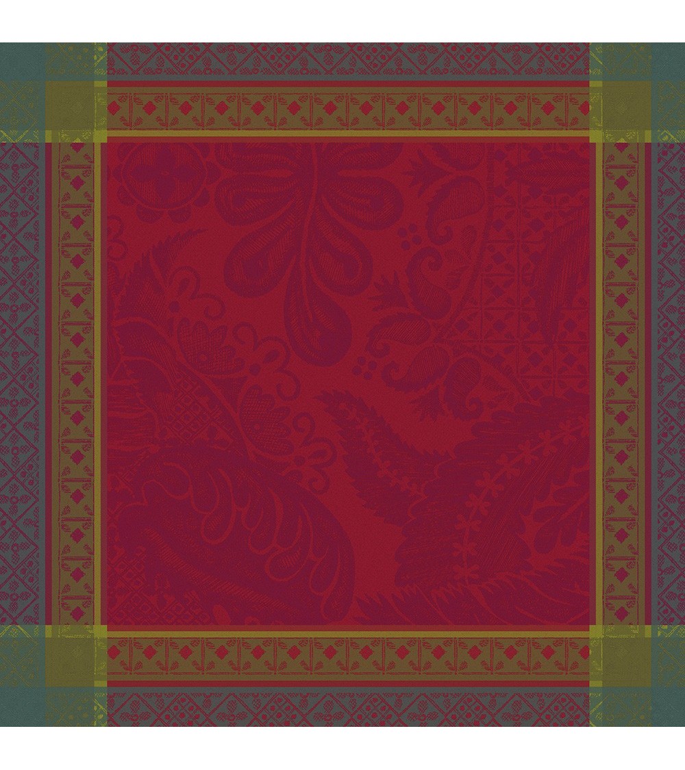 Serviette 100 pour cent coton damassée (jacquard) fabriquée en France à Gérardmer. Linge des Vosges. Motifs dont la finesse est particulièrement mise en valeur par le tissage en compte serré. Matière - 100 pour cent coton peigné. Couleur dominante - rubis. Taille (largeur x longueur) - 54X54. Traitement - . Type - jacquard tissage fin. Style - Prestige. Finitions - Finitions raffinées avec coins capuchons. Grammage - . Entretien - Laver séparément à 40degrés avant la première utilisation. Une tache s'incruste plus facilement sur un linge non prélavé.Laver en machine avec une lessive couleurs pour le linge de couleur. Respecter les instructions de lavage de l'étiquette cousue sur le produit.Cet article est labellisé Vosges Terre Textile. Il a été tissé dans nos ateliers de Gérardmer - véritable linge fabriqué dans les Vosges !