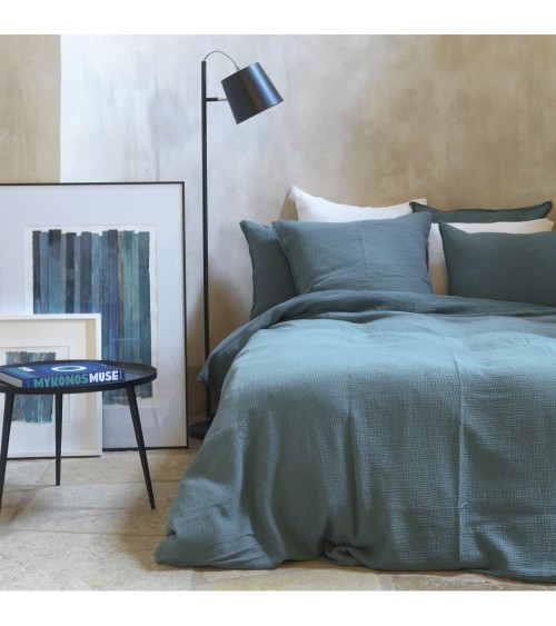 Taie d'oreiller en gaze de coton bleu minéral d'une douceur incroyable. Matière naturelle douce et moelleuse