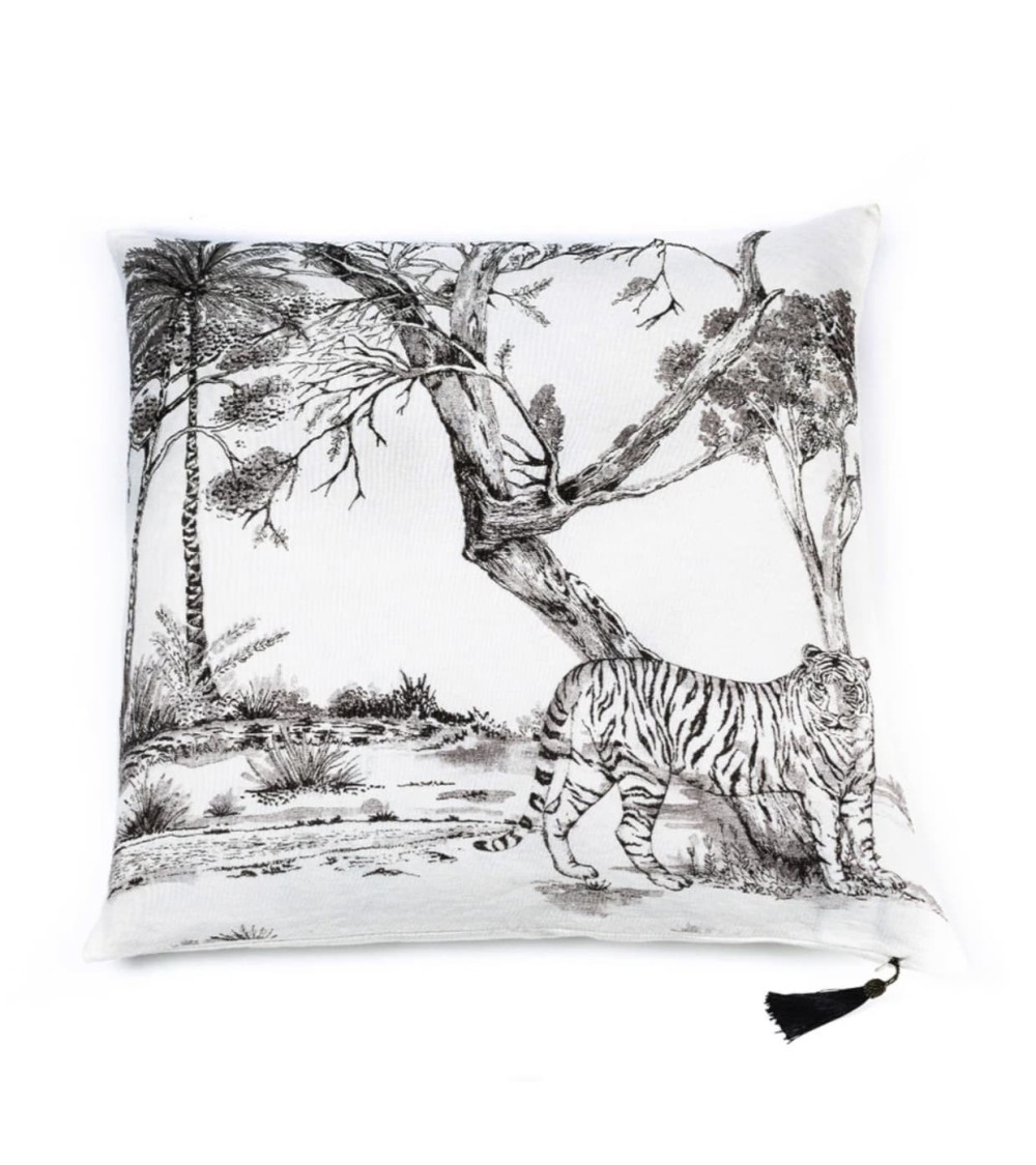 Le peintre et son chevalet ou l'encre avec l'écrivain - il y a des éléments qui vivent ensemble, dans l'unité, combinant leurs efforts pour refléter quelque chose en nous. De la même manière, l'arbre et les pâturages de la savane se confondent avec les animaux qui y vivent et deviennent indivisibles, car il est impossible d'imaginer l'un sans l'autre. Aujourd'hui, nous célébrons la nature et les animaux qui s'en nourrissent, les véritables propriétaires de la savane. Le baobab, l'adansonia, l'épiphyte et l'albizia sont des cadres qui complètent le tableau et les rythmes qui donnent vie à la mélodie du biome de notre planète. Housse de coussin en lin lavé, au motif Tiger avec sérigraphie et lavage du vêtement, avec fermeture à glissière invisible et pampilles noires.Le lin pèse 390 gr/m², ce qui lui assure une grande résistance et qualité.Notre linge a subi un traitement de lavage et de teinture sur le vêtement qui lui apporte douceur et confort.Les traces sauvages de nos paysages et des animaux de la savane exigent une technique qui parvient à transmettre la même vie que celle qui est respirée dans la peinture originale. À cette occasion, nous utilisons la sérigraphie. Un moule est généré, où chaque ligne de chaque élément est séparée par un vernis spécialement préparé. Une maille est tendue et rapprochée du lin. C'est le moment où l'encre envahit la maille et où le dessin commence à naître. Une raclette est utilisée pour répartir l'encre jusqu'à ce qu'elle recouvre tout. La touche finale est donnée par la séparation des mailles. Là, le dessin est fini de naître. Là, le processus est terminé.Chaque coussin qui prend vie grâce à la sérigraphie est unique, car cette technique est reproduite individuellement. Les mains sont toujours présentes ici, où l'encre d'un instant recouvre tout et où le vernis du moule donne la touche de grâce, séparant les excès et donnant la vie aux arbres comme aux animaux.Fabriqué en Espagne.