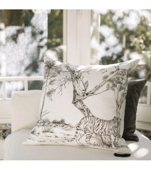 Coussin en lin pur lavé Toile de Jouy Blanc noir 65x65