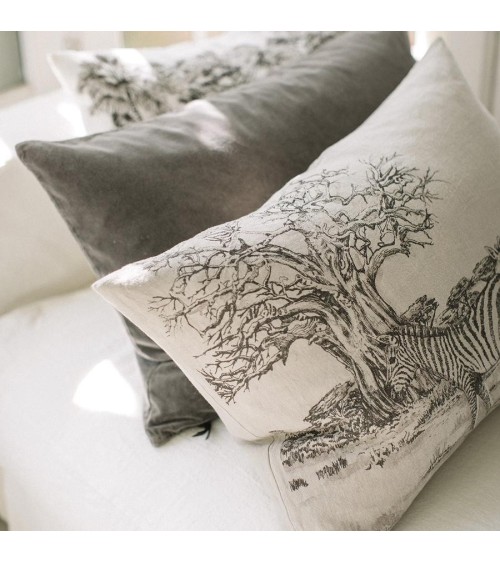 Le peintre et son chevalet ou l'encre avec l'écrivain - il y a des éléments qui vivent ensemble, dans l'unité, combinant leurs efforts pour refléter quelque chose en nous. De la même manière, l'arbre et les pâturages de la savane se confondent avec les animaux qui y vivent et deviennent indivisibles, car il est impossible d'imaginer l'un sans l'autre. Aujourd'hui, nous célébrons la nature et les animaux qui s'en nourrissent, les véritables propriétaires de la savane. Le baobab, l'adansonia, l'épiphyte et l'albizia sont des cadres qui complètent le tableau et les rythmes qui donnent vie à la mélodie du biome de notre planète. Housse de coussin en lin lavé, au motif Zèbre avec sérigraphie et lavage du vêtement, avec fermeture à glissière invisible et pampilles noires.Le lin pèse 390 gr/m², ce qui lui assure une grande résistance et qualité.Notre linge a subi un traitement de lavage et de teinture sur le vêtement qui lui apporte douceur et confort.Les traces sauvages de nos paysages et des animaux de la savane exigent une technique qui parvient à transmettre la même vie que celle qui est respirée dans la peinture originale. À cette occasion, nous utilisons la sérigraphie. Un moule est généré, où chaque ligne de chaque élément est séparée par un vernis spécialement préparé. Une maille est tendue et rapprochée du lin. C'est le moment où l'encre envahit la maille et où le dessin commence à naître. Une raclette est utilisée pour répartir l'encre jusqu'à ce qu'elle recouvre tout. La touche finale est donnée par la séparation des mailles. Là, le dessin est fini de naître. Là, le processus est terminé.Chaque coussin qui prend vie grâce à la sérigraphie est unique, car cette technique est reproduite individuellement. Les mains sont toujours présentes ici, où l'encre d'un instant recouvre tout et où le vernis du moule donne la touche de grâce, séparant les excès et donnant la vie aux arbres comme aux animaux.Fabriqué en Espagne.