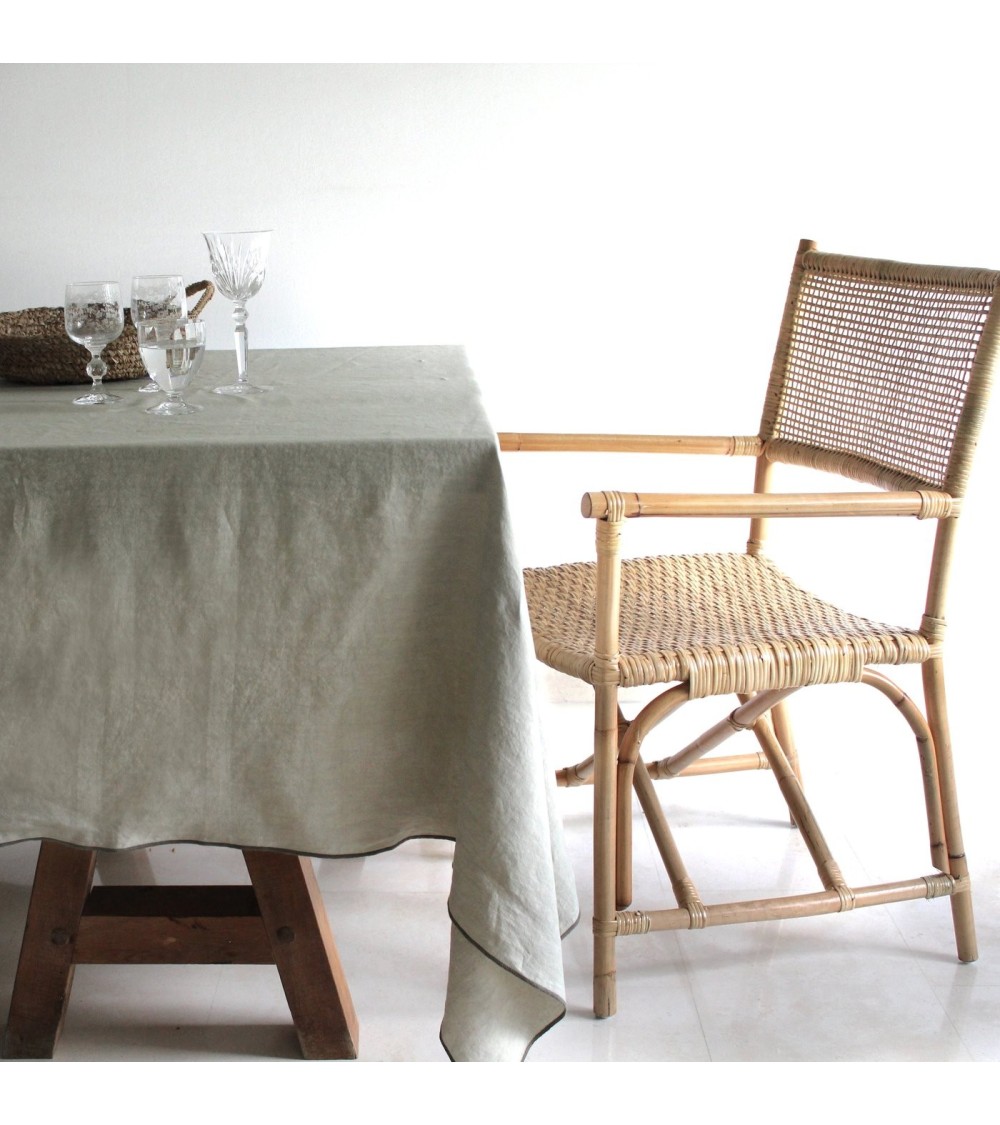 Le lin, avant qu'il ne soit le lin, était une plante herbacée, et bien qu'il soit une plante, il a choisi d'être une tige, car s'il avait été une graine, il ne s'appellerait plus lin mais graine de lin, et aurait fini en huile ou en farine de lin. Mais il a choisi d'être une tige et est devenu le lin, la plus ancienne fibre textile connue.Un bon linge se reconnaît de loin, car il tombe avec fierté protocolaire d'une table bien dressée quand il s'agit d'une nappe. Il est doux et distingué, et nous l'avons teint de belles couleurs pour l'installer dans nos cuisines comme nappe, serviettes, sets de table et torchons. Nappe de lin lavée en kaki avec surjet kaki foncé. Notre linge a subi un traitement de lavage et de teinture sur le vêtement qui lui apporte douceur et confort.