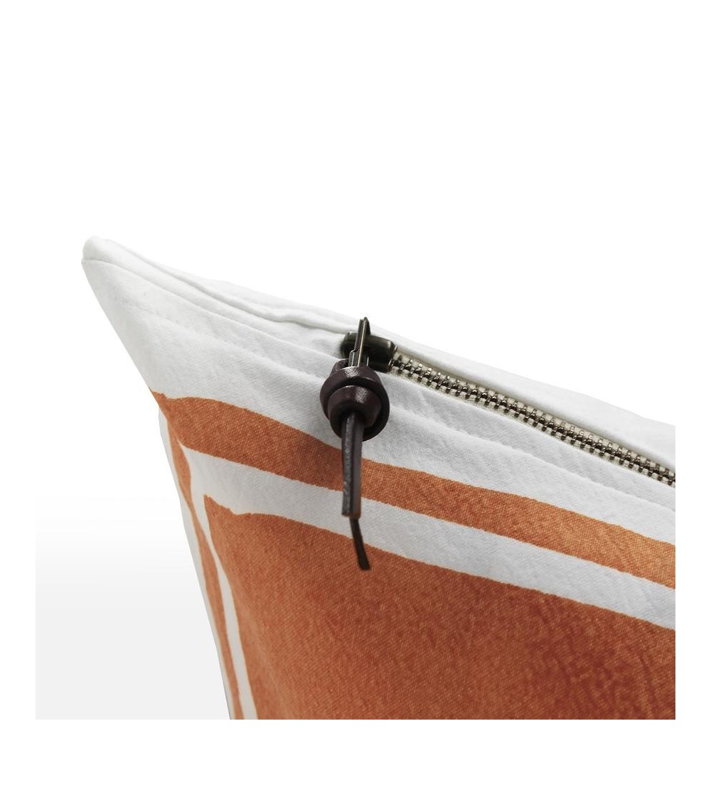 Housse de coussin en coton, au motif Cap Sa Sal avec sérigraphie et avec fermeture éclair en métal et détails en cuir. La conception du cadre de notre Cap Sa Sal nécessite une technique qui parvient à reproduire la couleur du design original. À cette occasion, nous avons eu recours à la sérigraphie. Un moule est généré, où chaque ligne est séparée par un vernis spécialement préparé. Une maille est tendue et rapprochée du coton. C'est le moment où l'encre envahit la maille et où les détails commencent à naître. Une raclette est utilisée pour répartir l'encre jusqu'à ce qu'elle recouvre tout. La touche finale est donnée par la séparation des mailles. Chaque coussin qui prend vie grâce à la sérigraphie est unique, car cette technique est reproduite individuellement.