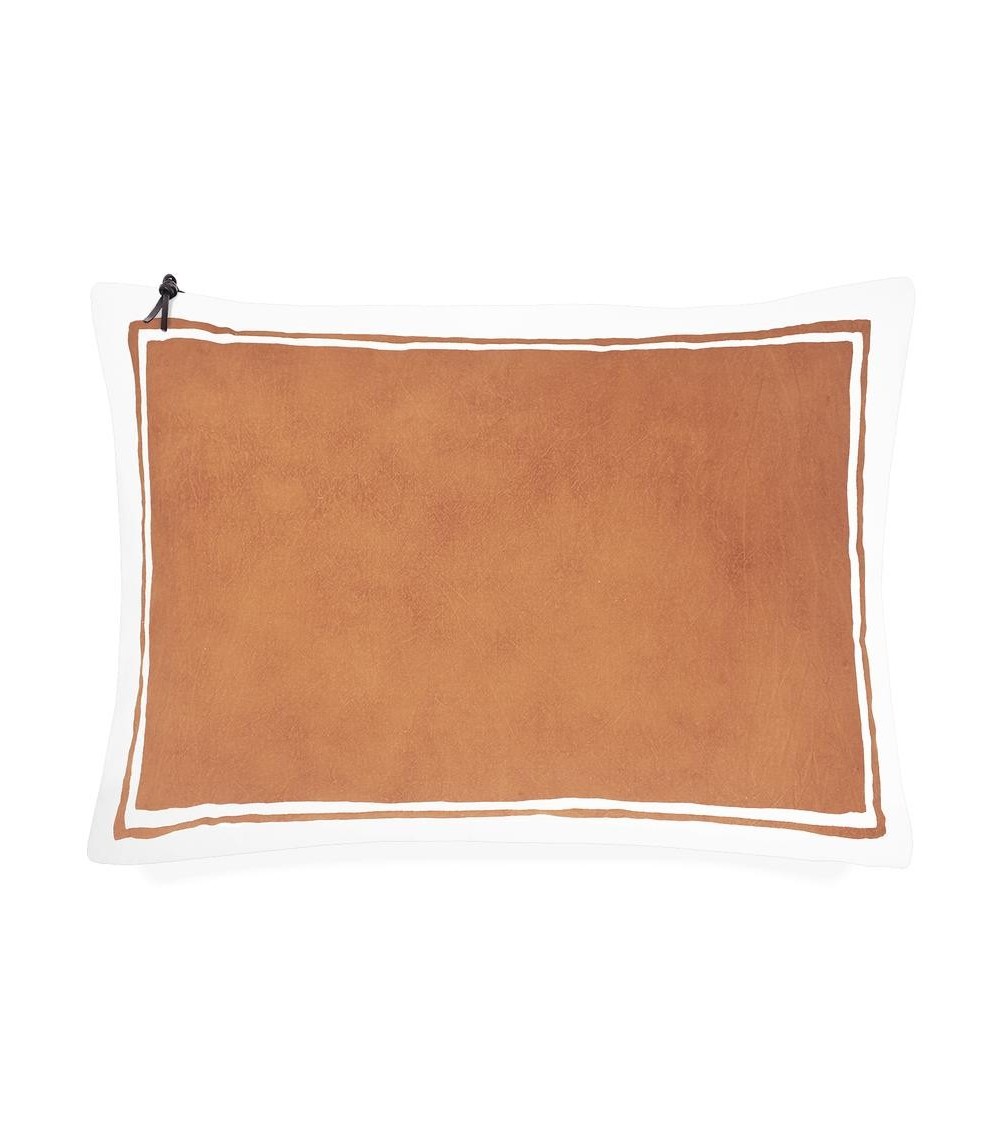 Housse de coussin en coton, au motif Cap Sa Sal avec sérigraphie et avec fermeture éclair en métal et détails en cuir. La conception du cadre de notre Cap Sa Sal nécessite une technique qui parvient à reproduire la couleur du design original. À cette occasion, nous avons eu recours à la sérigraphie. Un moule est généré, où chaque ligne est séparée par un vernis spécialement préparé. Une maille est tendue et rapprochée du coton. C'est le moment où l'encre envahit la maille et où les détails commencent à naître. Une raclette est utilisée pour répartir l'encre jusqu'à ce qu'elle recouvre tout. La touche finale est donnée par la séparation des mailles. Chaque coussin qui prend vie grâce à la sérigraphie est unique, car cette technique est reproduite individuellement.