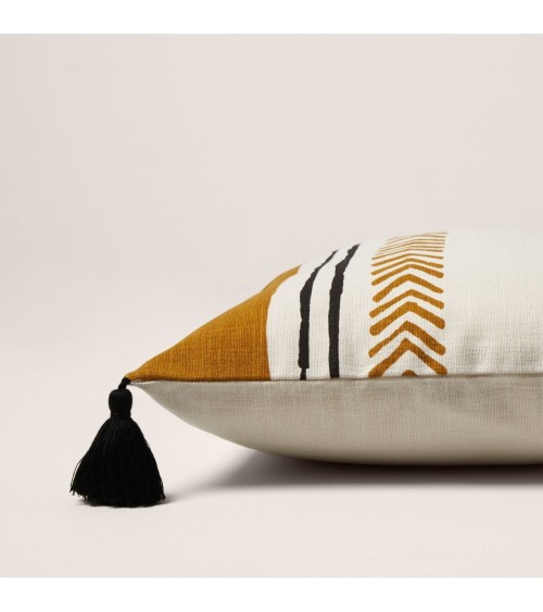 La collection Mahdi est composée dun rideau à oeillets noirs et de deux housses de coussin. Elle saura égailler vos intérieurs avec ses motifs imprimés graphiques et chaleureux inspirés du tissu Bogolan, très populaire au Mali. Le mix&match des dessins aux graphismes simples apportera un caractère résolument nomade à nos intérieurs. Les coloris ocre et noir nous rappellent les terres chaudes et accueillantes de lAfrique. On aime - le détail des petits pompons noirs qui terminent lenveloppe de coussin.